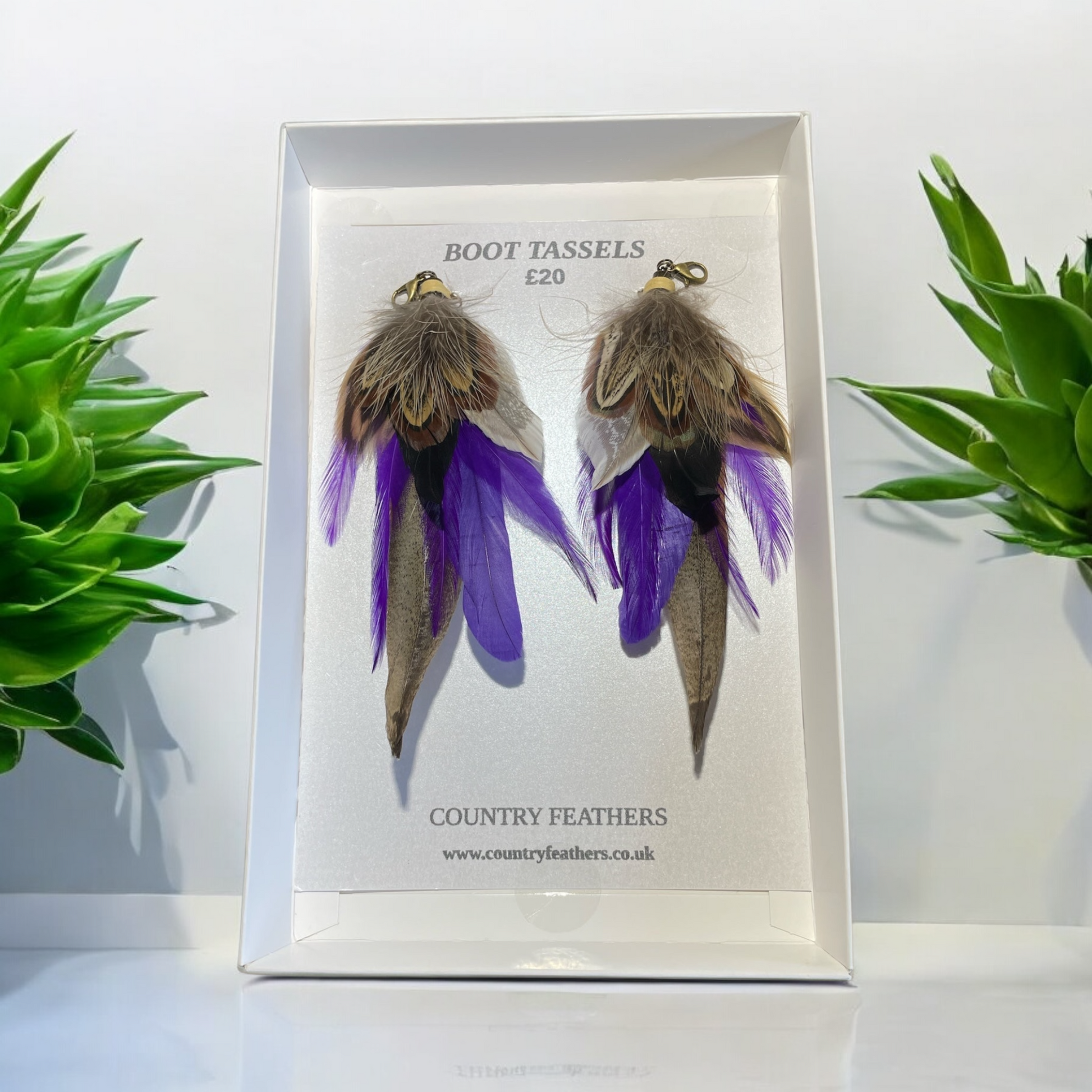 A pair of brass style boot tassels with pheasant, rooster and duck feathers with small clasp to attach to the outside zip for a stunning accessory to your boots. The goose feathers have been dyed indigo to give a stunning contrast the natural feathers.