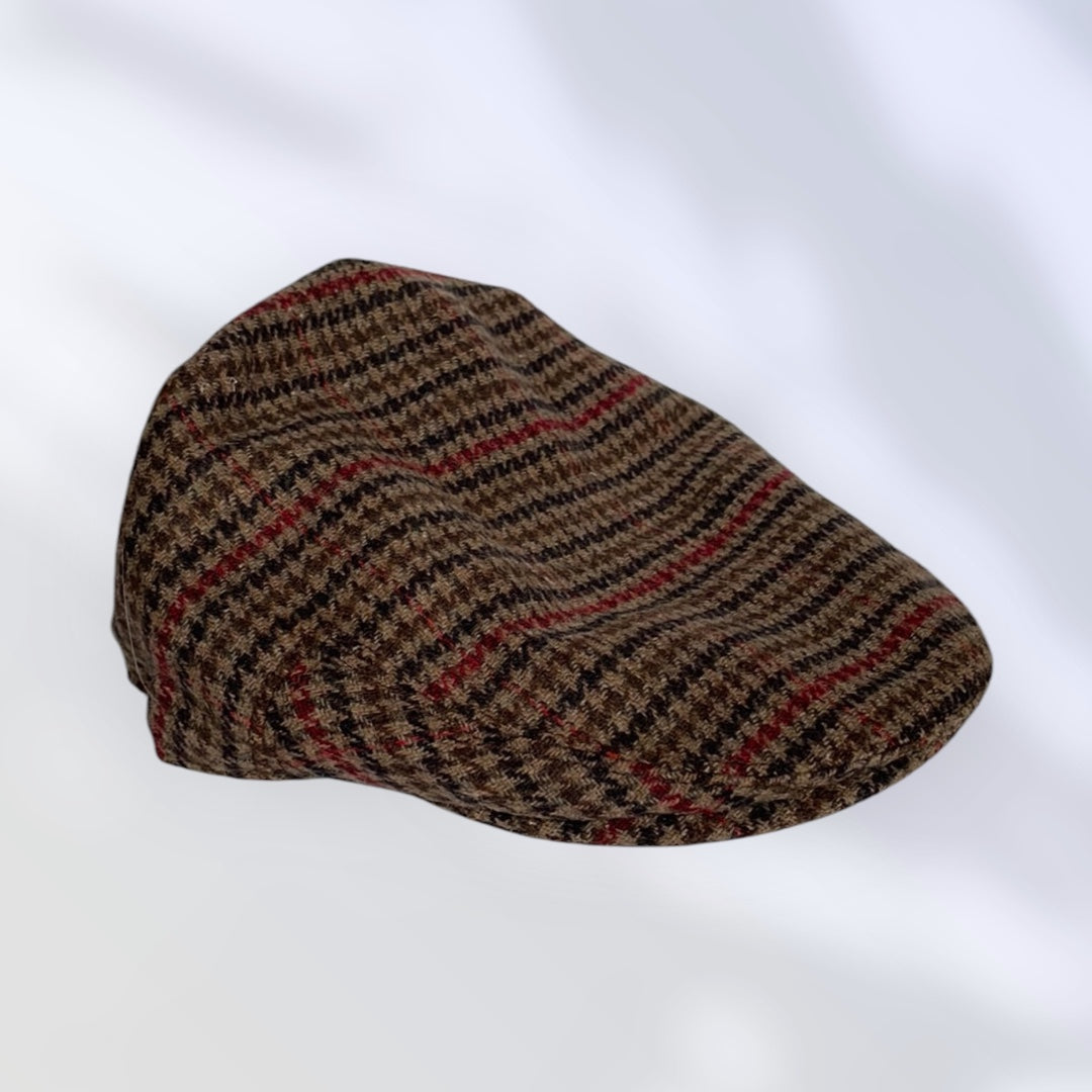 A brown wool mix tweed flat cap in warm tones with 100% polyester lining.