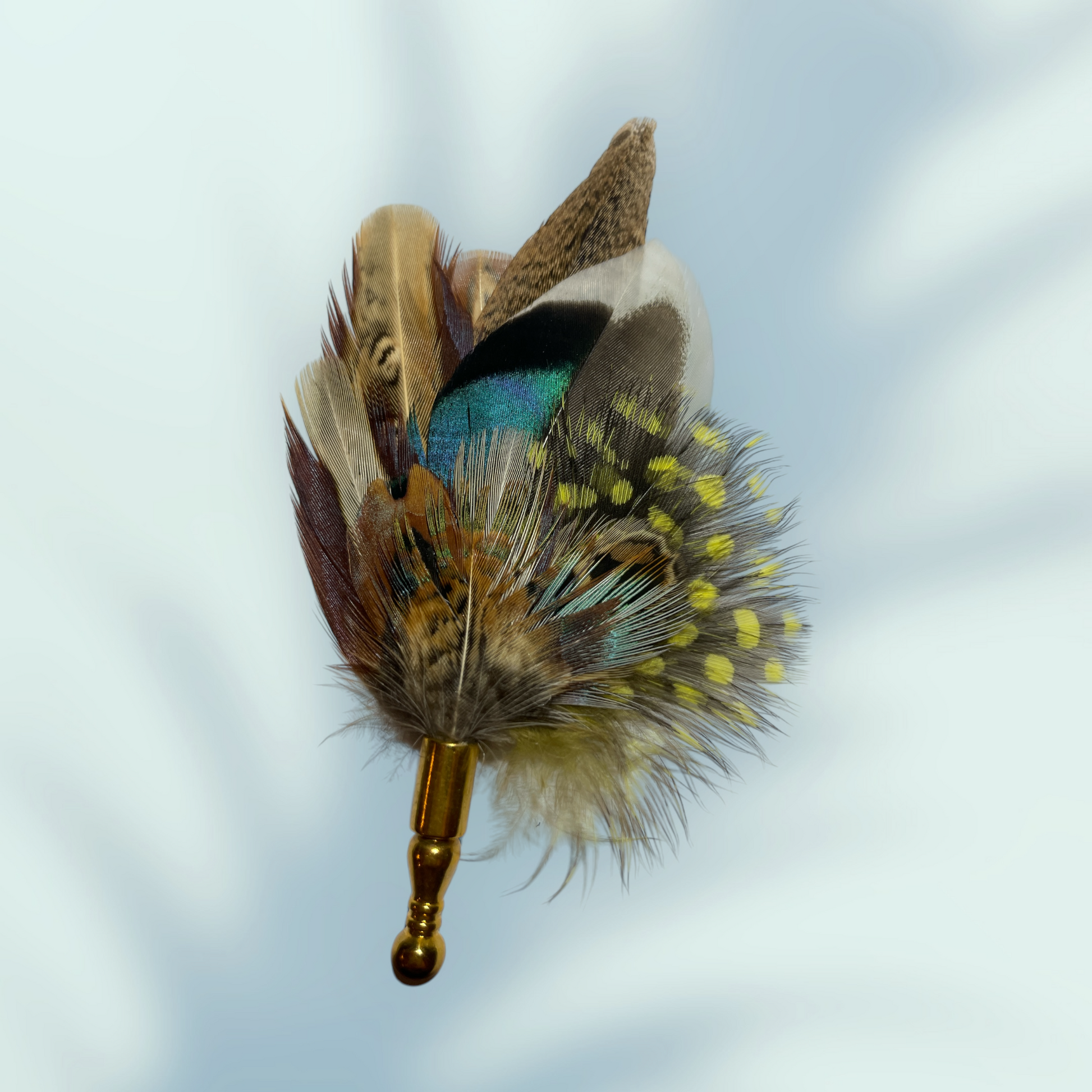 Duck, pheasant and guinea fowl feathers set in a gold-coloured metal lapel holder with a tie tack butterfly pin to secure to your jacket, dress or hat.