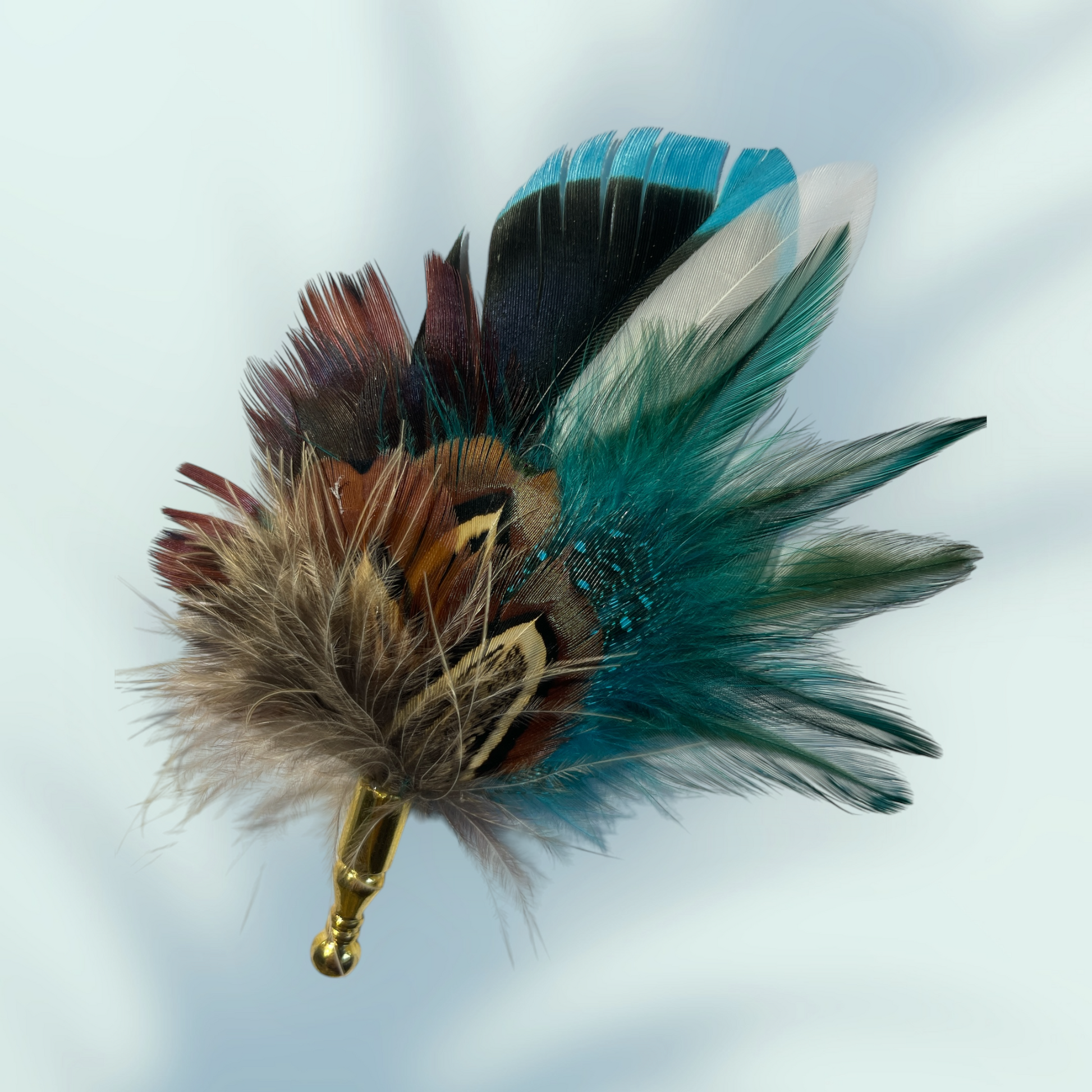 Teal & Natural Feather Lapel Pin in a Gold Clasp (CFLP164)