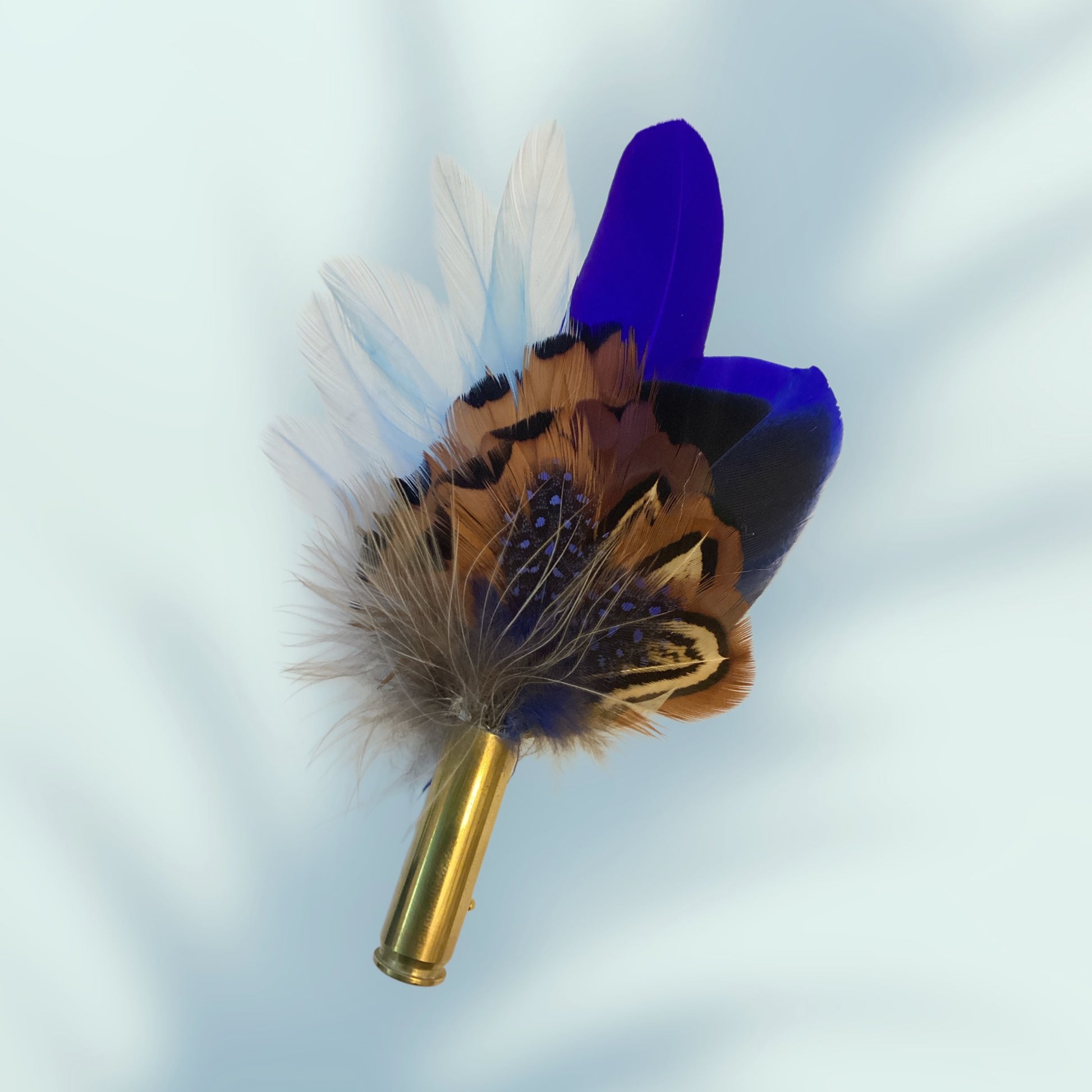 Pheasant, duck, goose with blue dyed guinea fowl feathers set in a brass bullet case with pin & magnet to secure to your jacket, dress or hat.