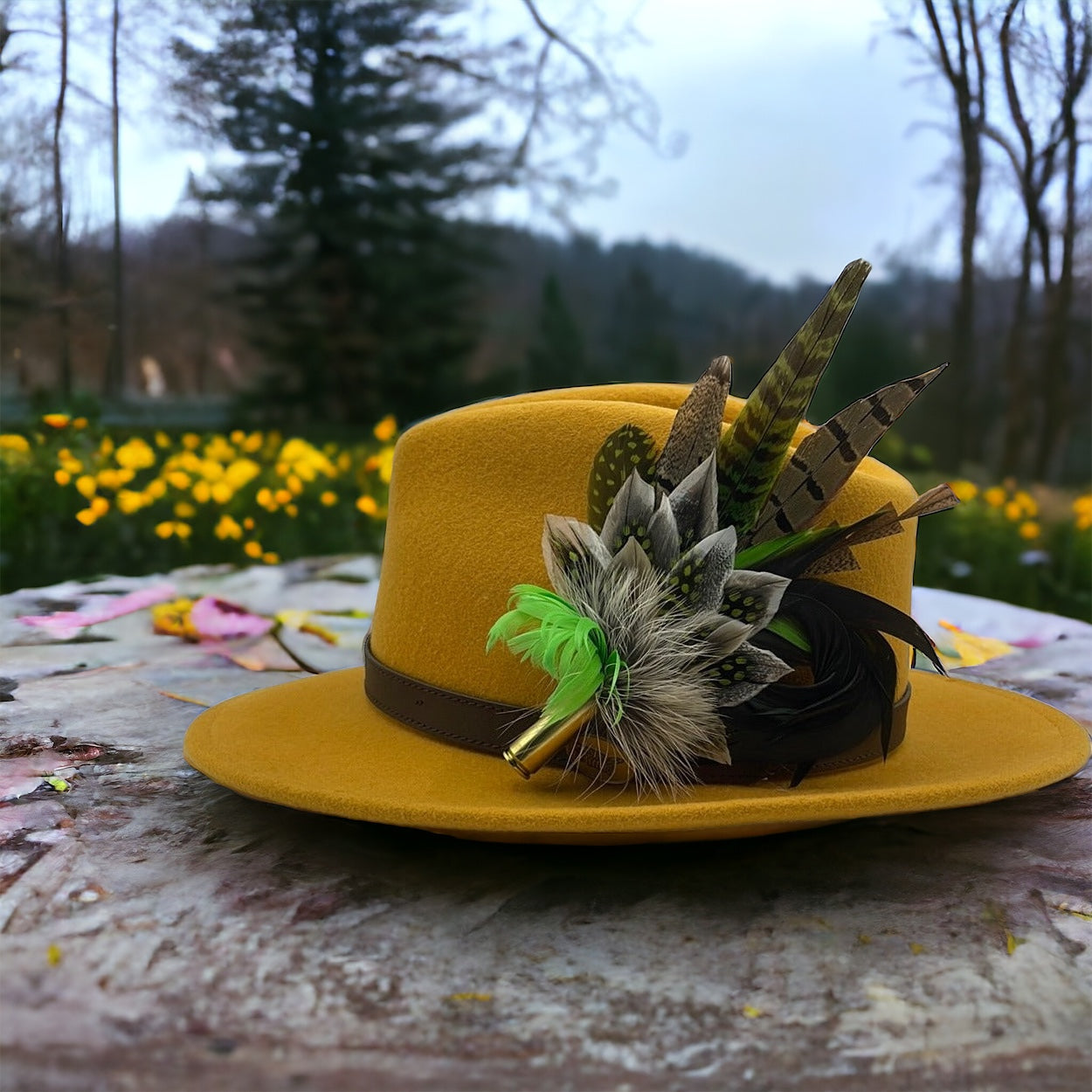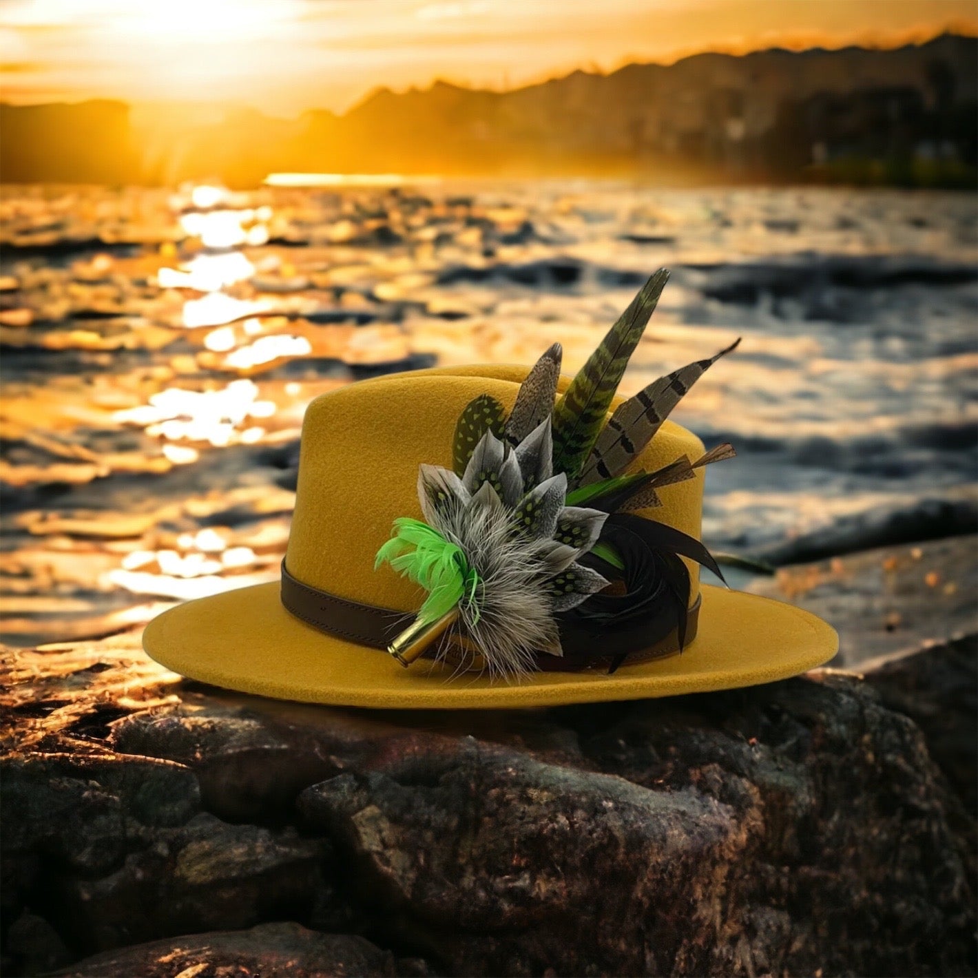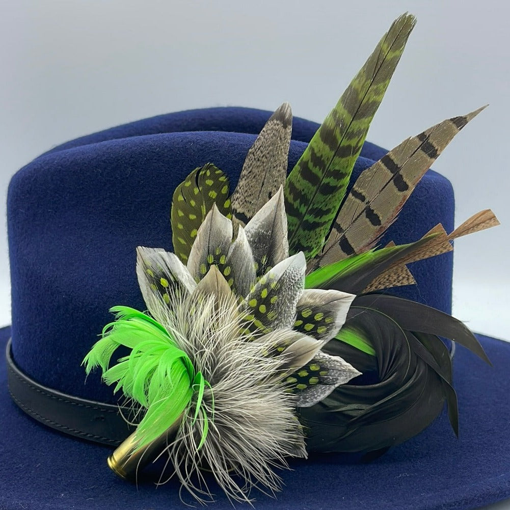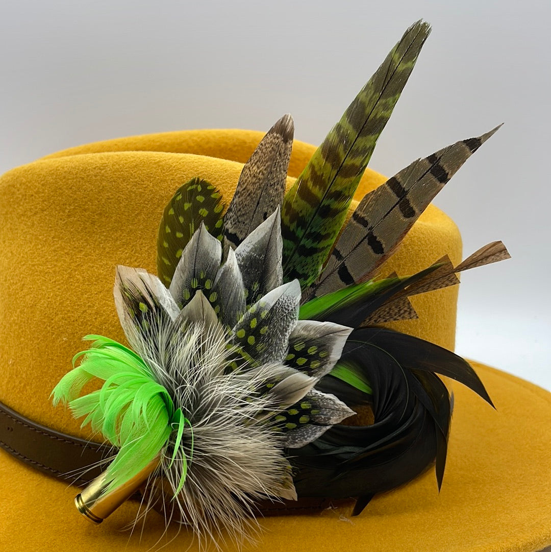 Feathers are in a recycled polished bullet case with a clasp attached for pinning through the ribbon band or over the leather band on the hat. We add a magnet to the feathers for extra security and to minimise the movement of the feathers on the hat.