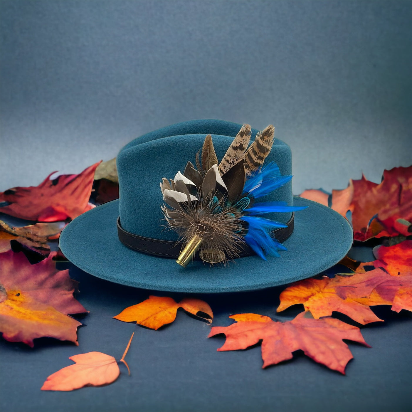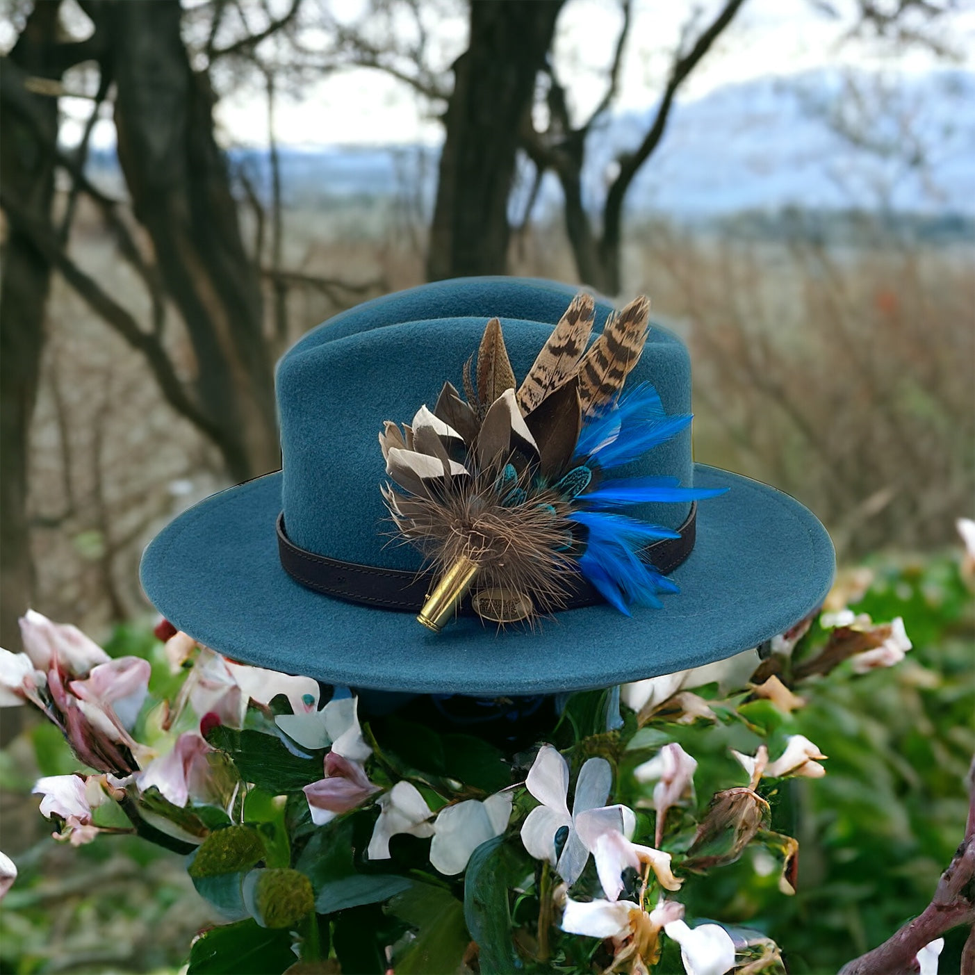 Feathers are in a recycled polished bullet case with a clasp attached for pinning through the ribbon band or over the leather band on the hat. We add a magnet to the feathers for extra security and to minimise the movement of the feathers on the hat.