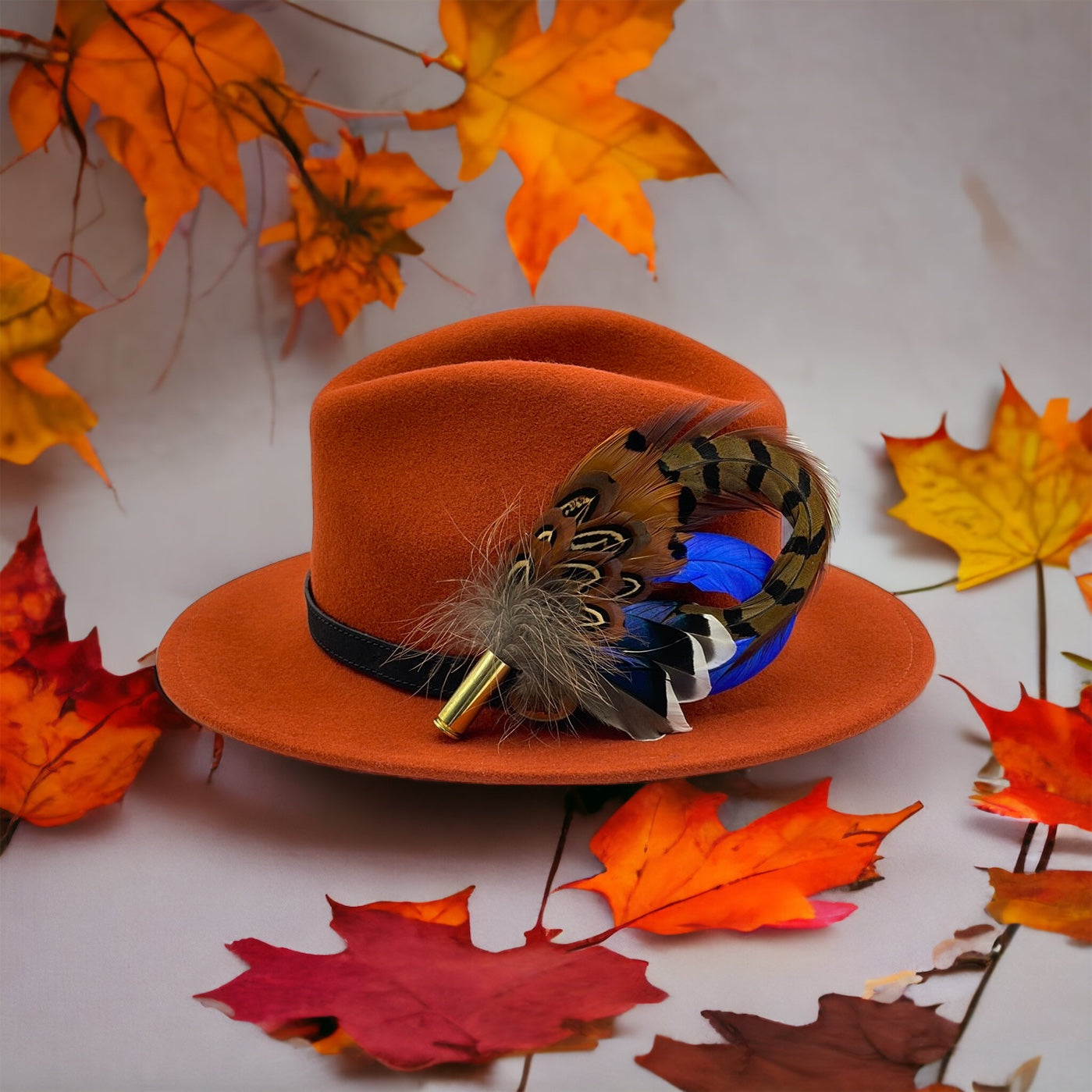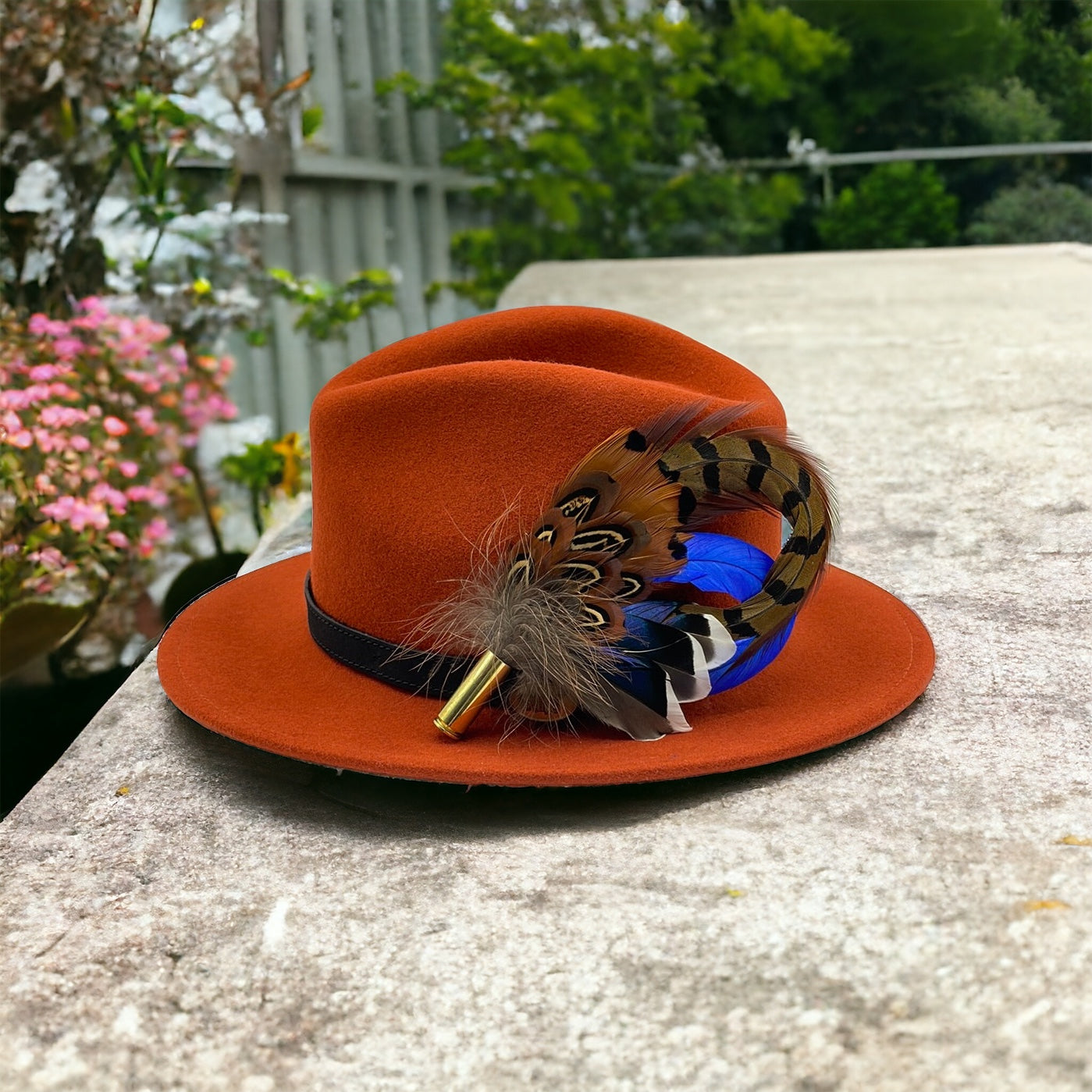 Feathers are in a recycled polished bullet case with a clasp attached for pinning through the ribbon band or over the leather band on the hat. We add a magnet to the feathers for extra security and to minimise the movement of the feathers on the hat.
