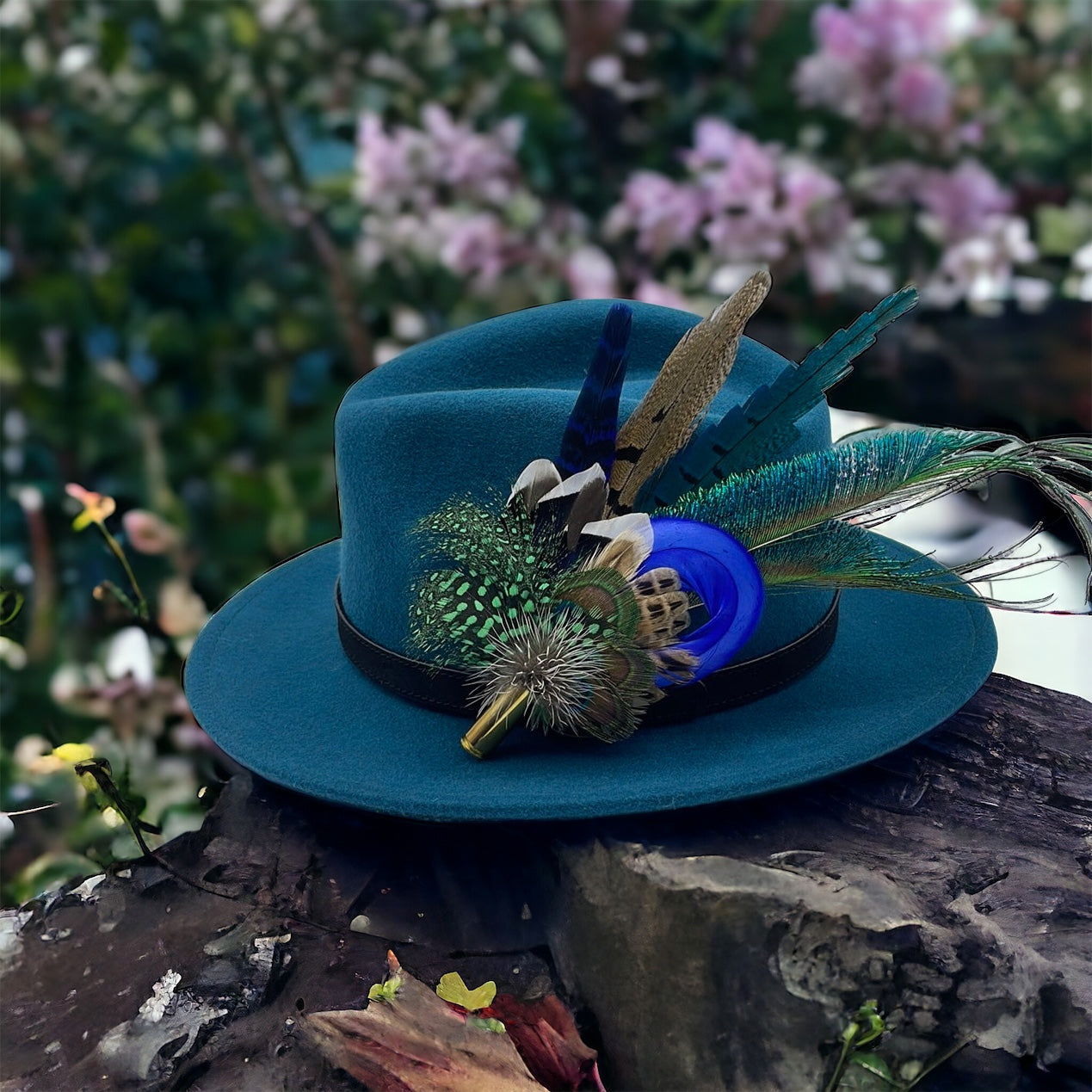 Feathers are in a recycled polished bullet case with a clasp attached for pinning through the ribbon band or over the leather band on the hat. We add a magnet to the feathers for extra security and to minimise the movement of the feathers on the hat.