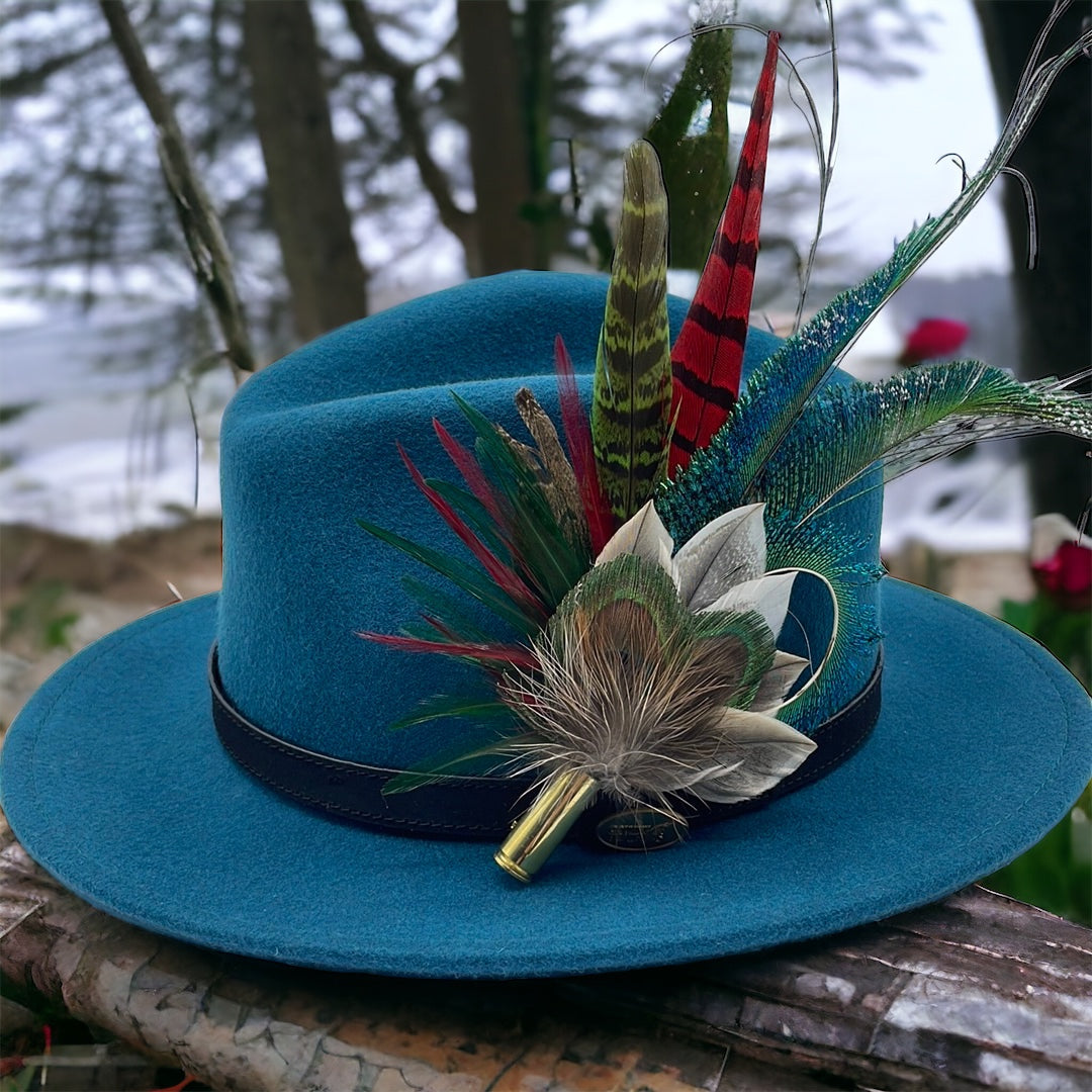 Feathers are in a recycled polished bullet case with a clasp attached for pinning through the ribbon band or over the leather band on the hat. We add a magnet to the feathers for extra security and to minimise the movement of the feathers on the hat.