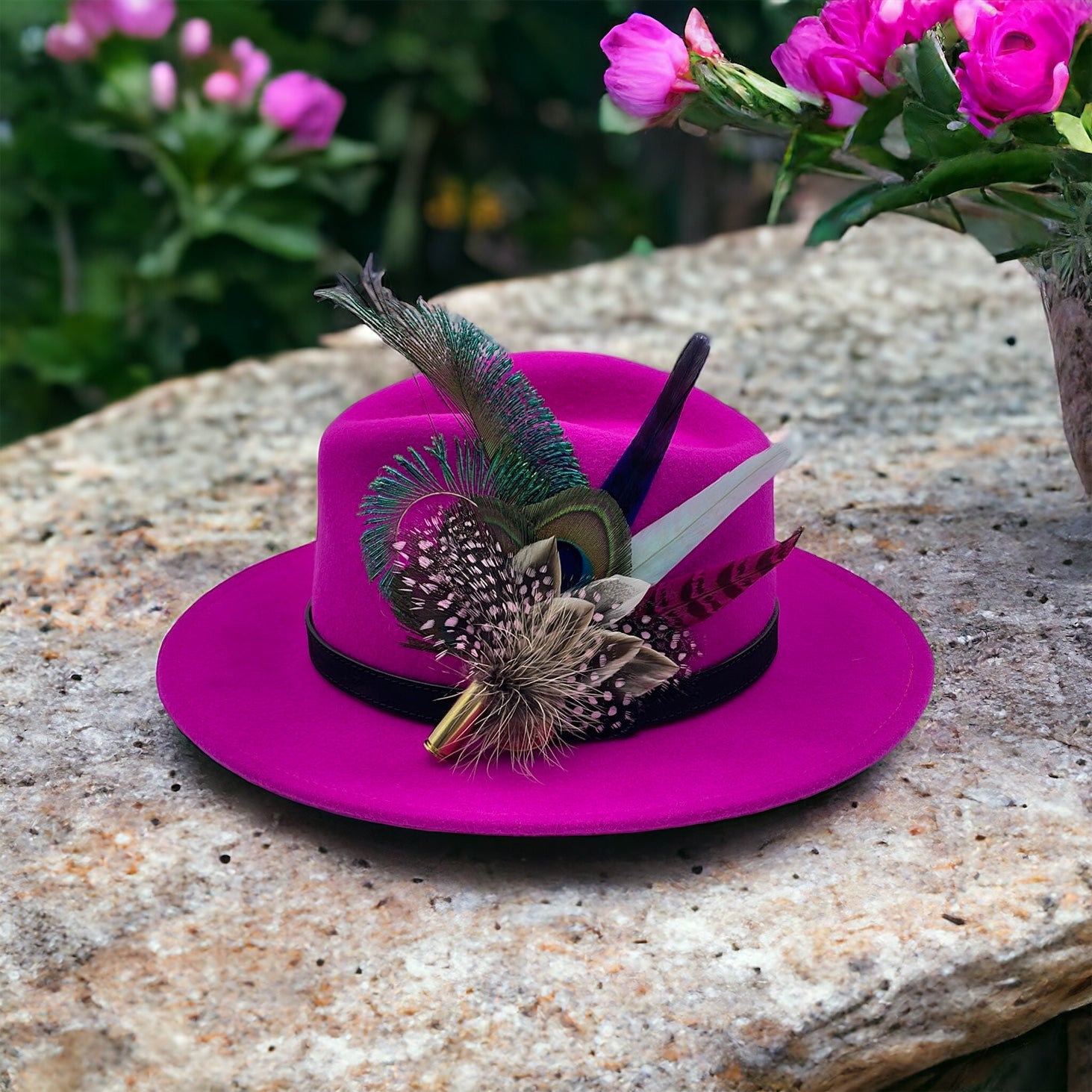 Feathers are in a recycled polished bullet case with a clasp attached for pinning through the ribbon band or over the leather band on the hat. We add a magnet to the feathers for extra security and to minimise the movement of the feathers on the hat.