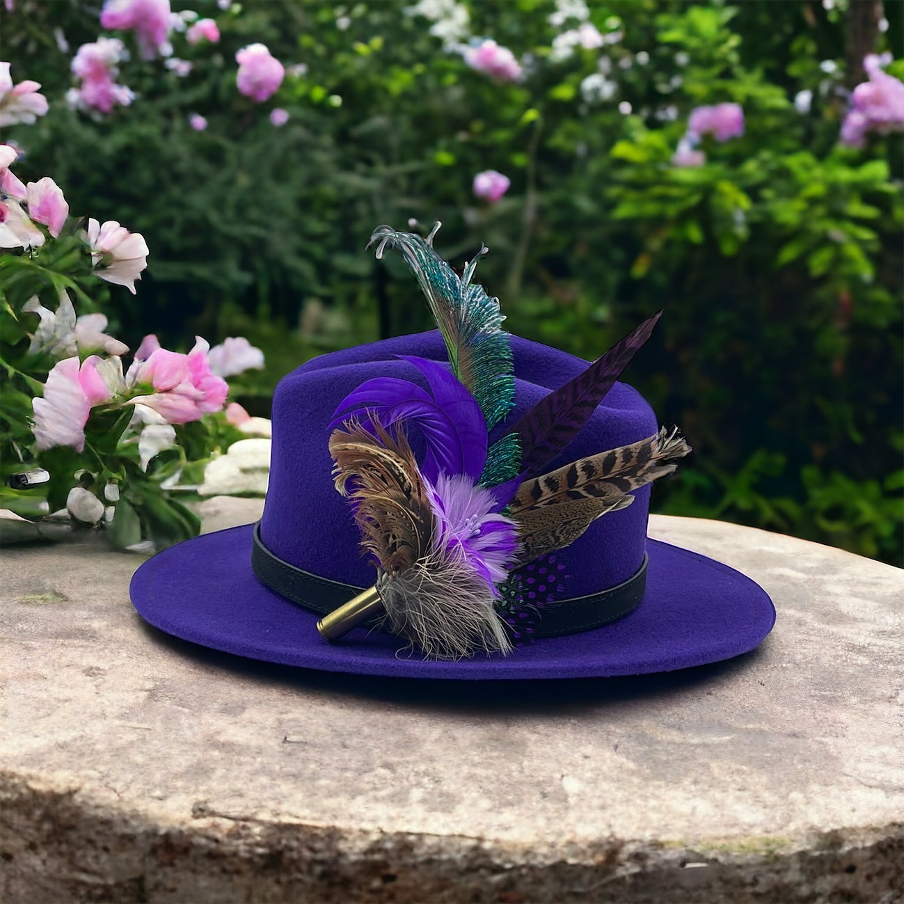 Feathers are in a recycled polished bullet case with a clasp attached for pinning through the ribbon band or over the leather band on the hat. We add a magnet to the feathers for extra security and to minimise the movement of the feathers on the hat.