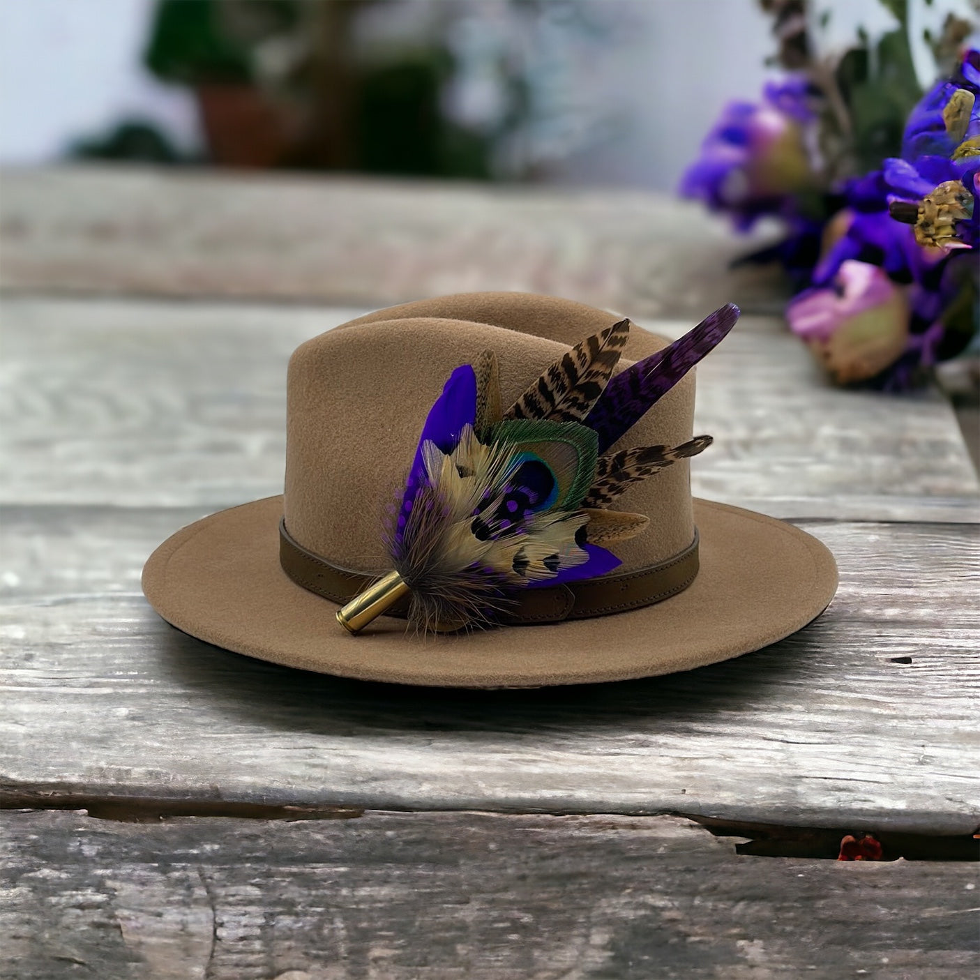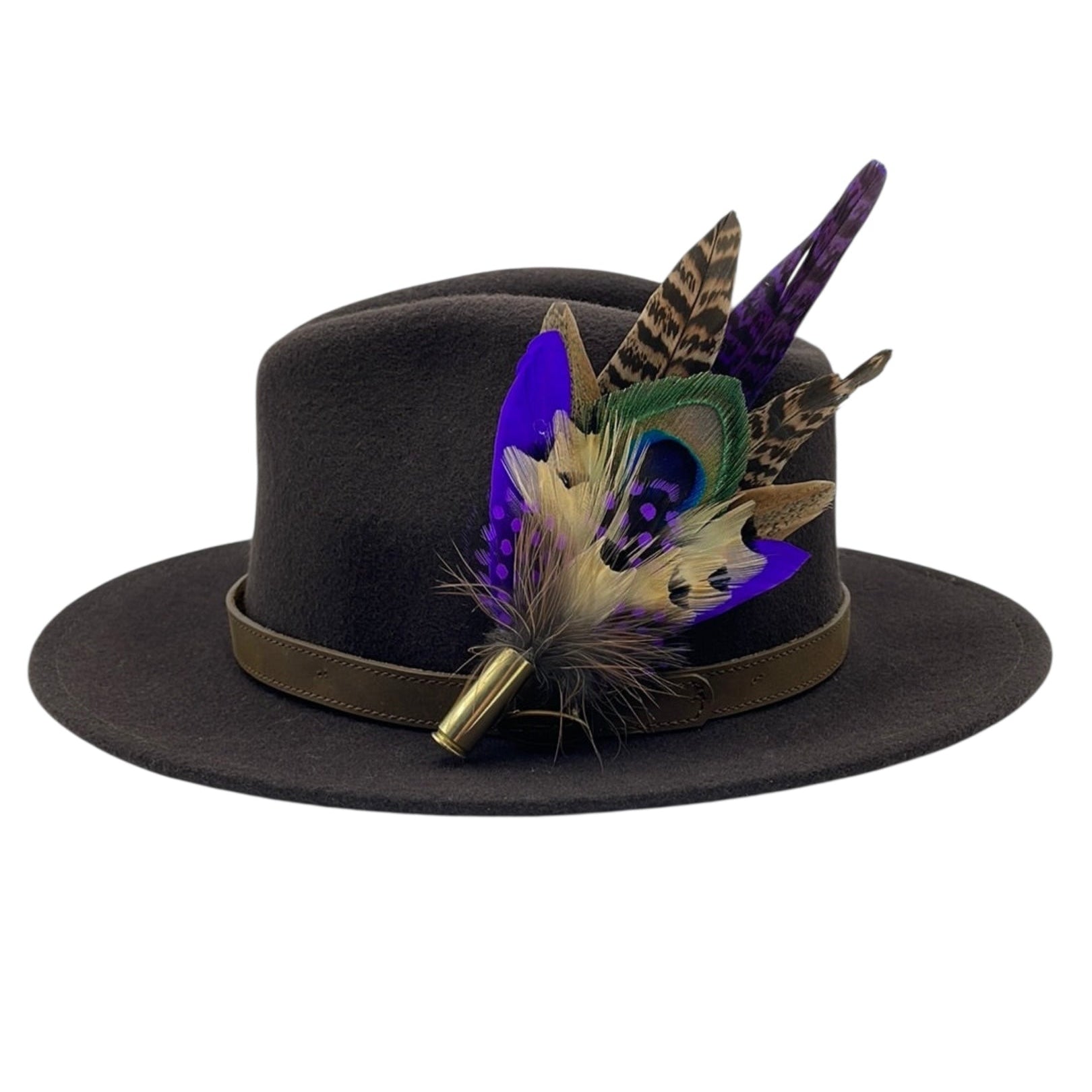 Feathers are in a recycled polished bullet case with a clasp attached for pinning through the ribbon band or over the leather band on the hat. We add a magnet to the feathers for extra security and to minimise the movement of the feathers on the hat.