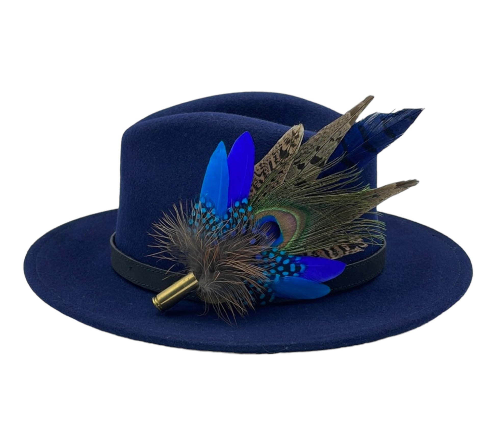 Feathers are in a recycled polished bullet case with a clasp attached for pinning through the ribbon band or over the leather band on the hat. We add a magnet to the feathers for extra security and to minimise the movement of the feathers on the hat.