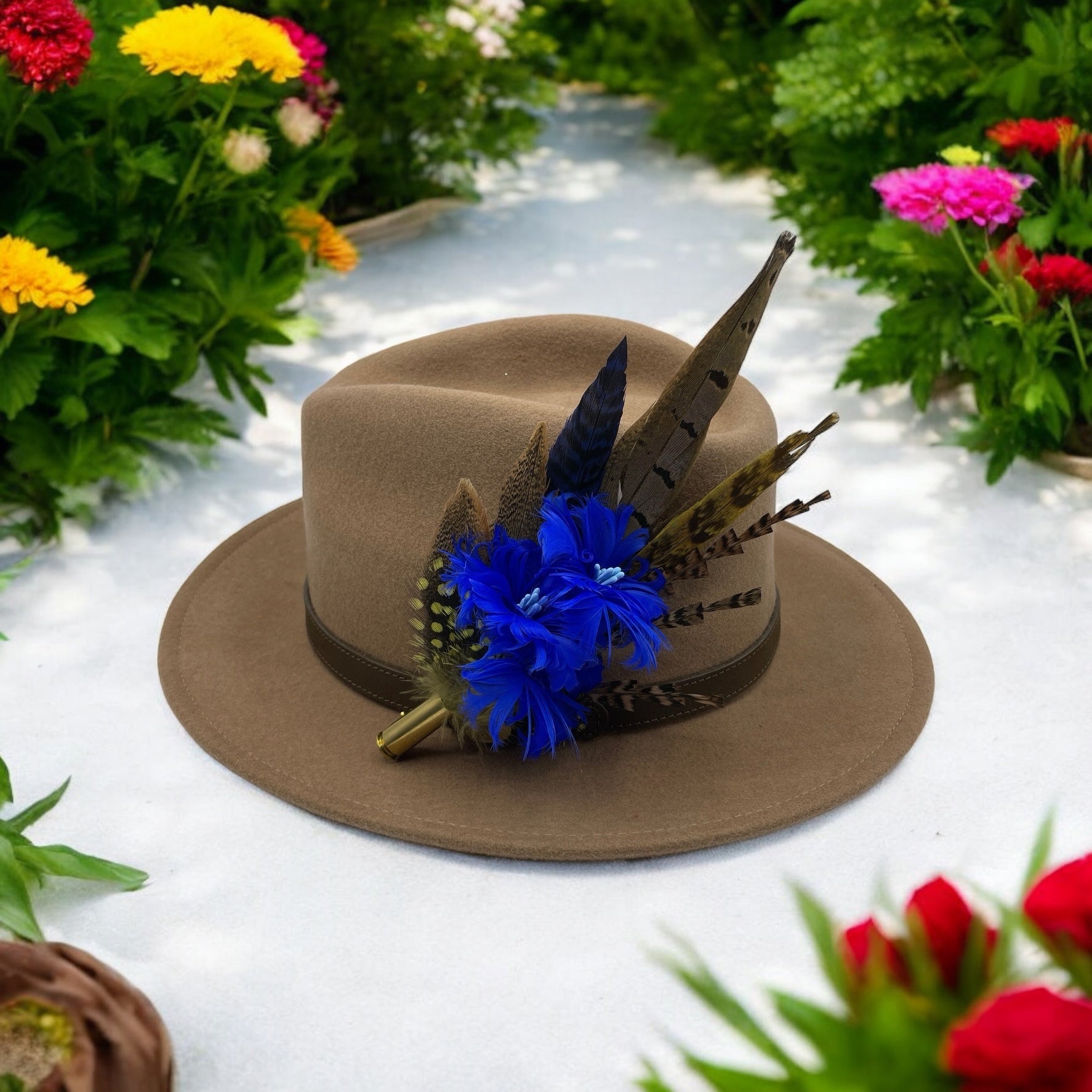 Feathers are in a recycled polished bullet case with a clasp attached for pinning through the ribbon band or over the leather band on the hat. We add a magnet to the feathers for extra security and to minimise the movement of the feathers on the hat.
