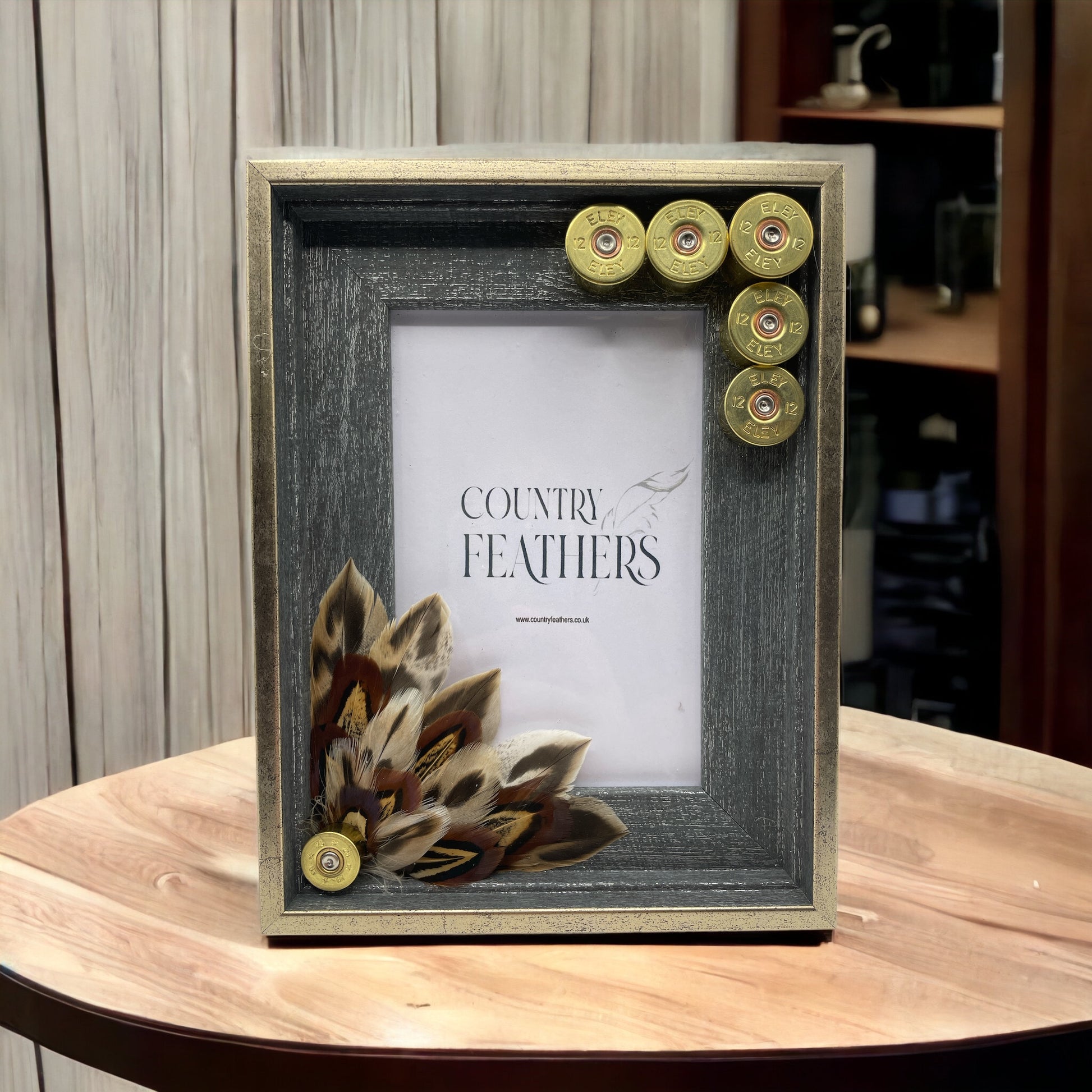 A rustic grey wood effect frame with a subtle metallic gold edging decorated in a recycled polished cartridge heads with pheasant and duck feathers.