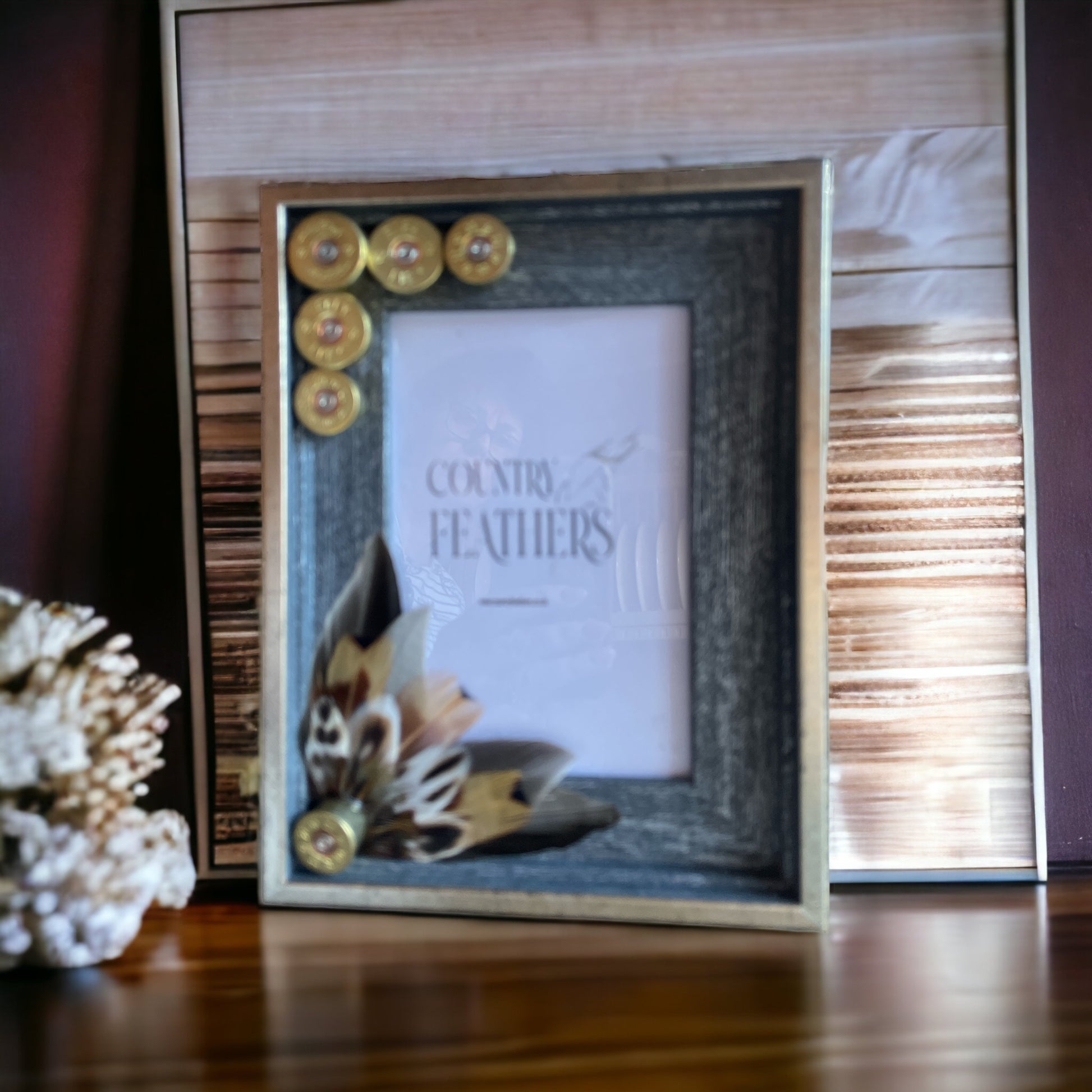 A rustic grey wood effect frame with a subtle metallic gold edging decorated in a recycled polished cartridge heads with Pheasant and Duck feathers.