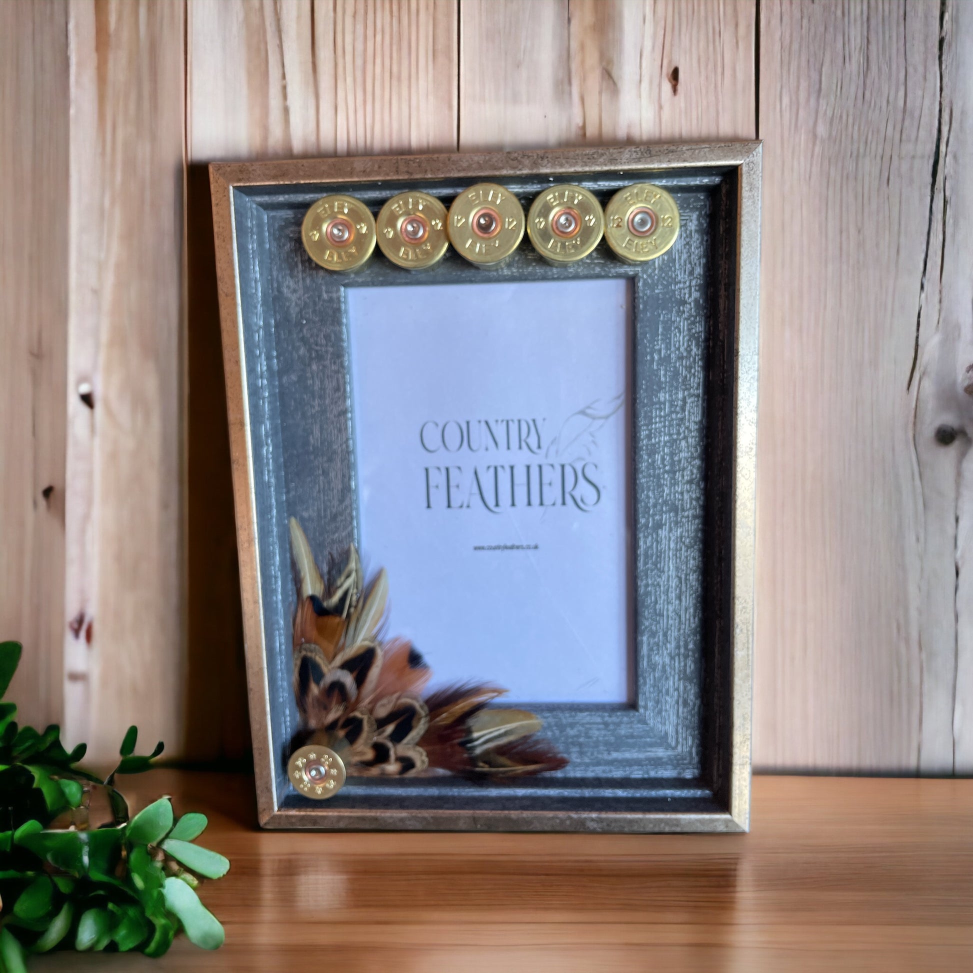 A rustic grey wood effect frame with a subtle metallic gold edging decorated in a recycled polished cartridge heads with Pheasant feathers. The country inspired frame fits a single 6x4 inch photo and can be wall hung or stood to suit your space.