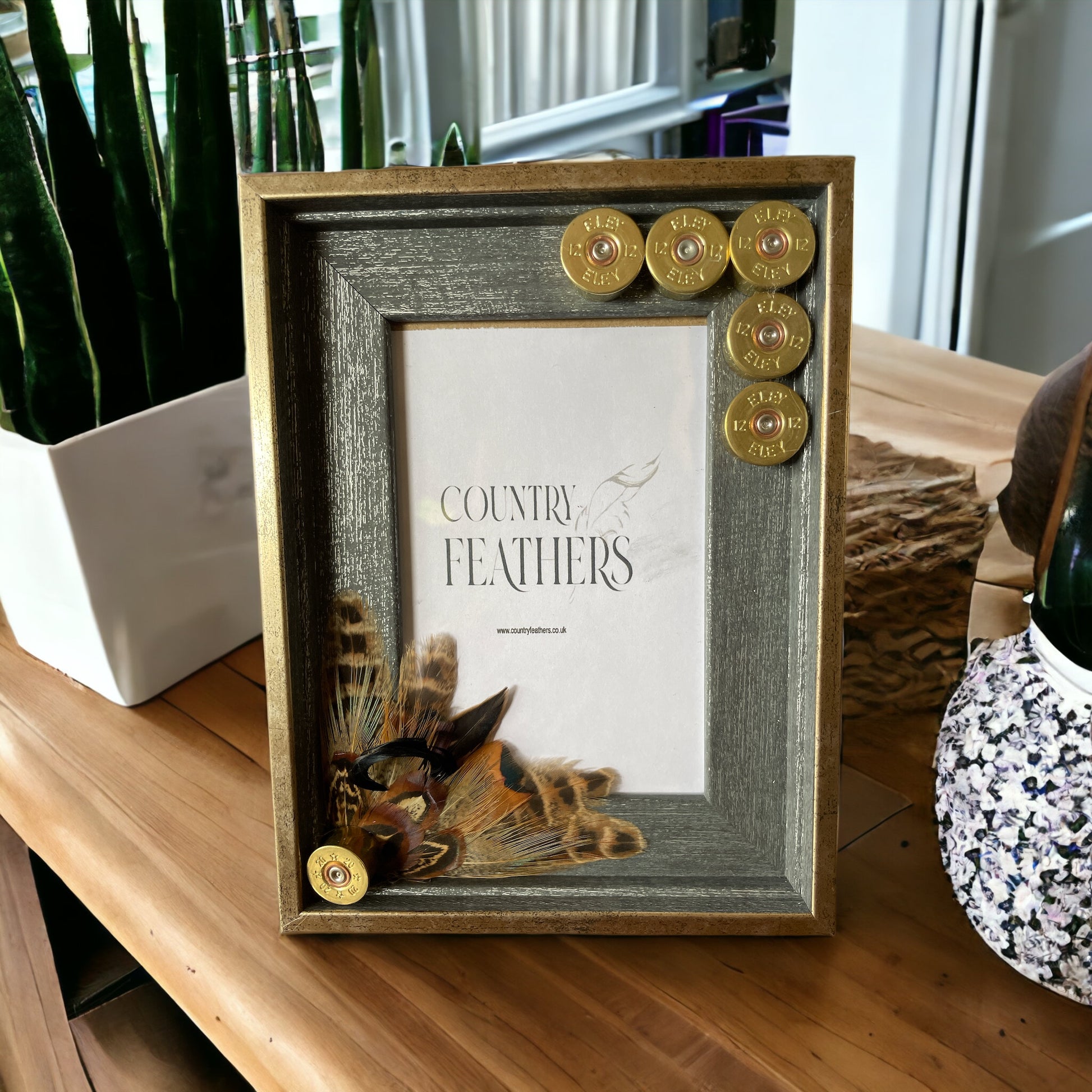 A rustic grey wood effect frame with a subtle metallic gold edging decorated in a recycled polished cartridge heads with pheasant and duck feathers.