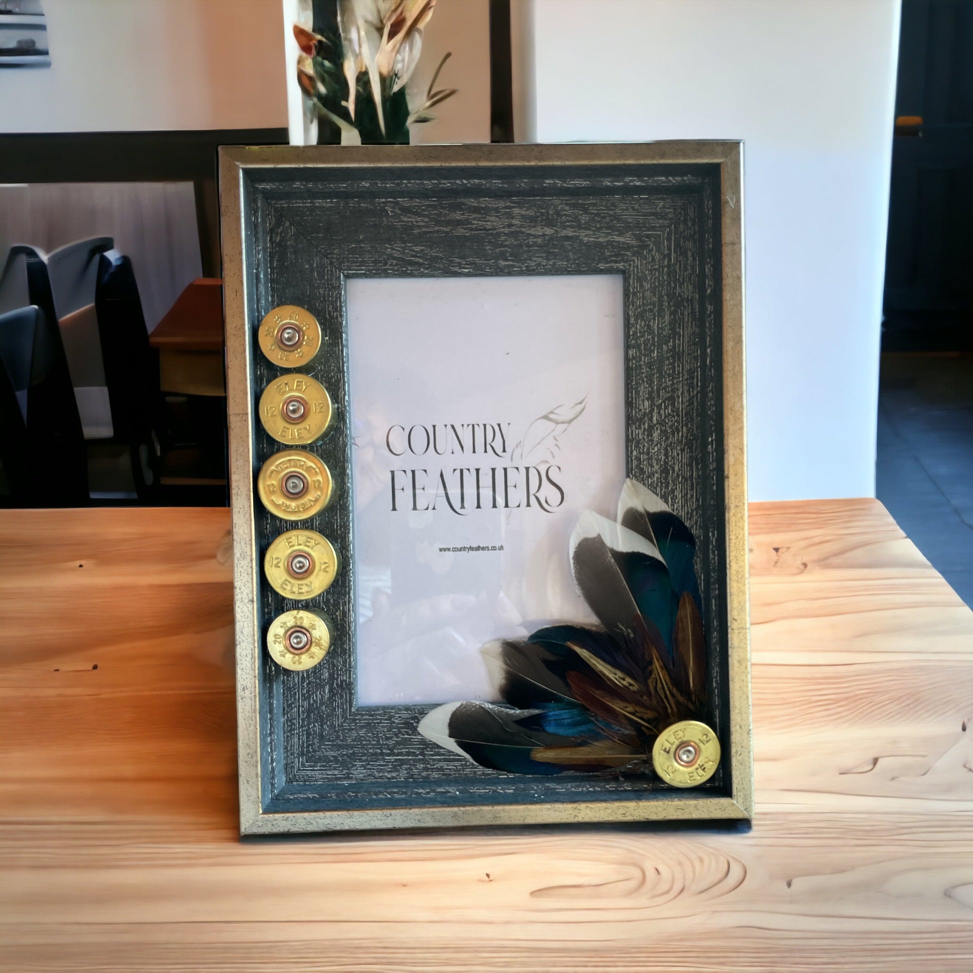 A rustic grey wood effect frame with a subtle metallic gold edging decorated in a recycled polished cartridge heads with Pheasant & Duck feathers.