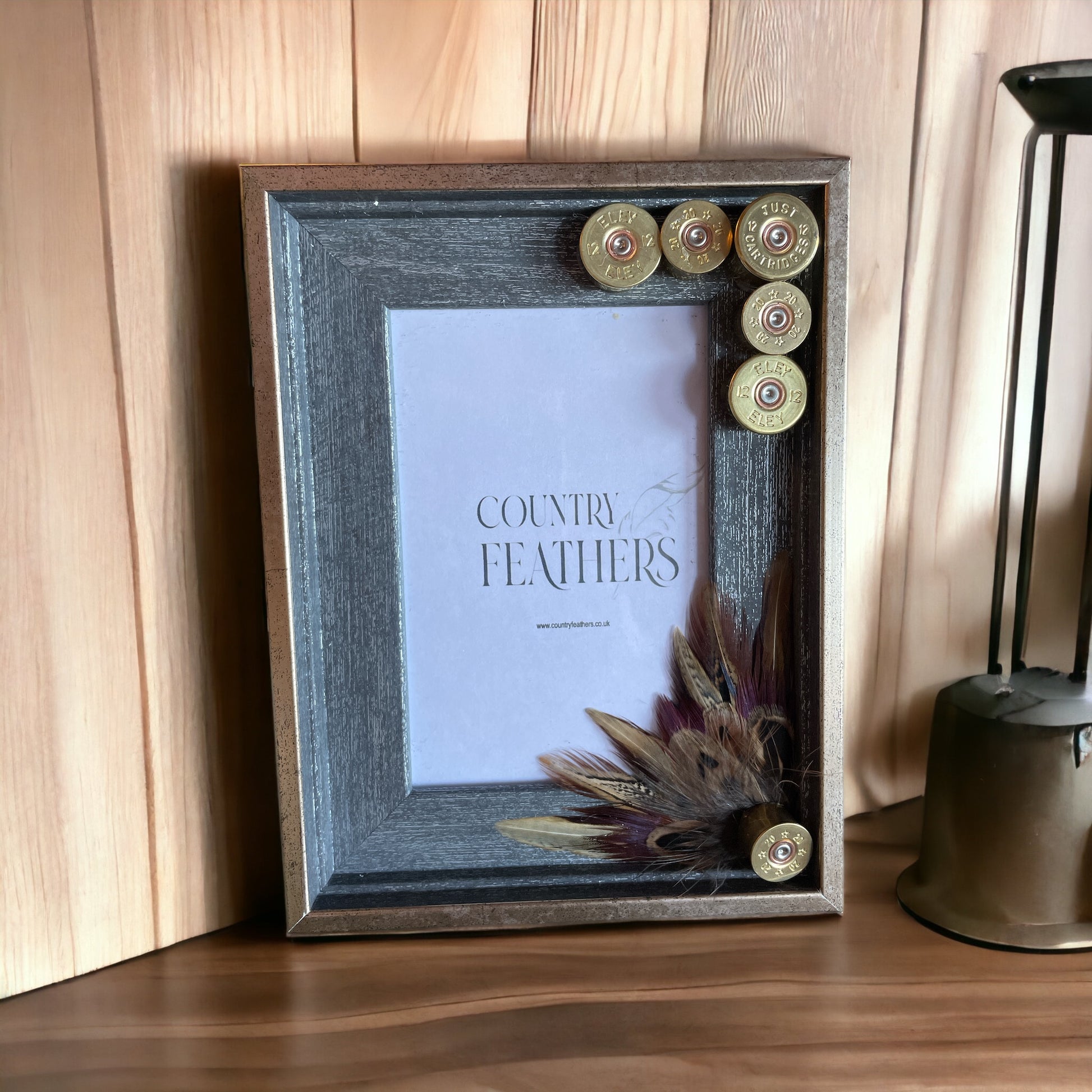 A rustic grey wood effect frame with a subtle metallic gold edging decorated in a recycled polished cartridge heads with Pheasant feathers. The country inspired frame fits a single 6x4 inch photo and can be wall hung or stood to suit your space.