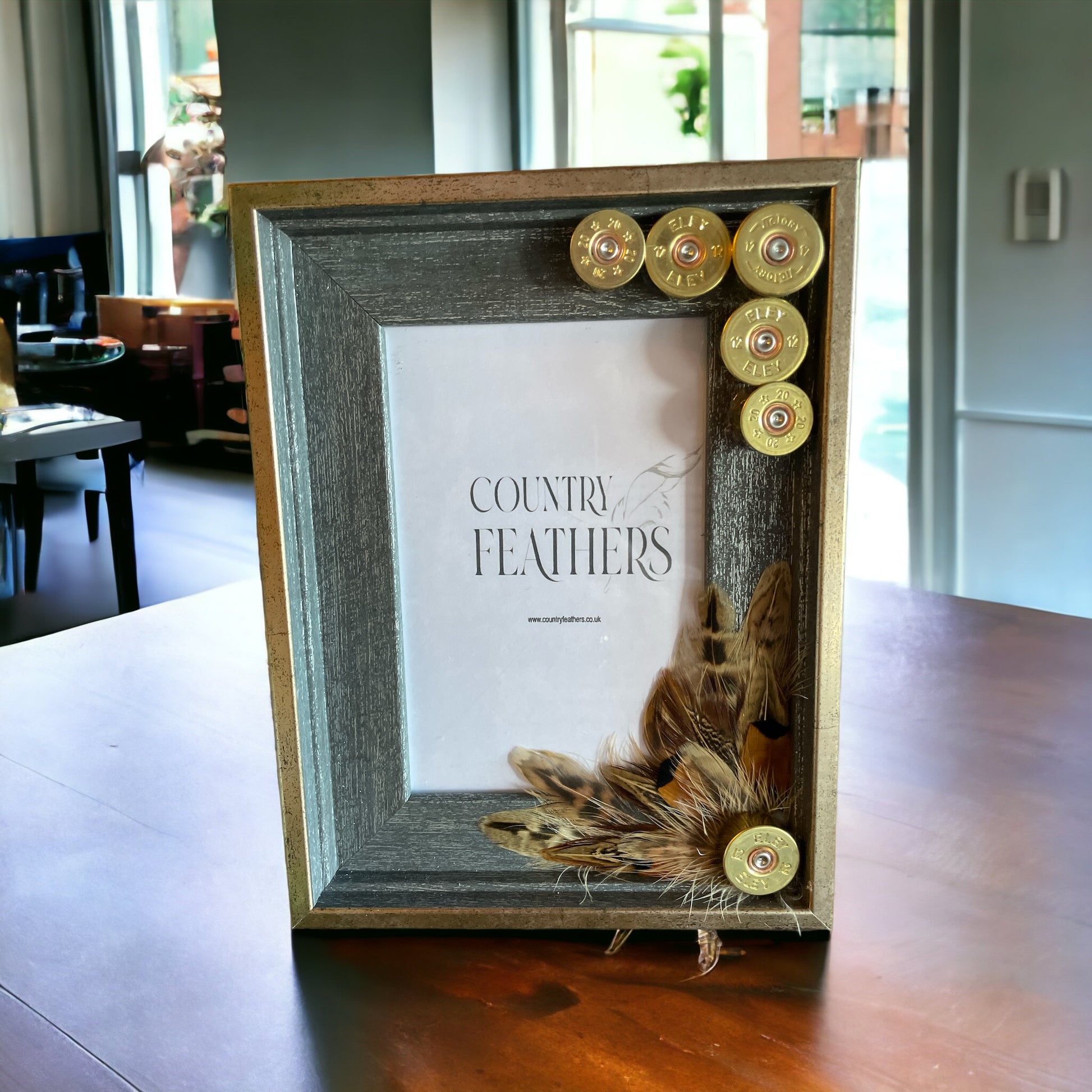 A rustic grey wood effect frame with a subtle metallic gold edging decorated in a recycled polished cartridge heads with Pheasant & Duck feathers.