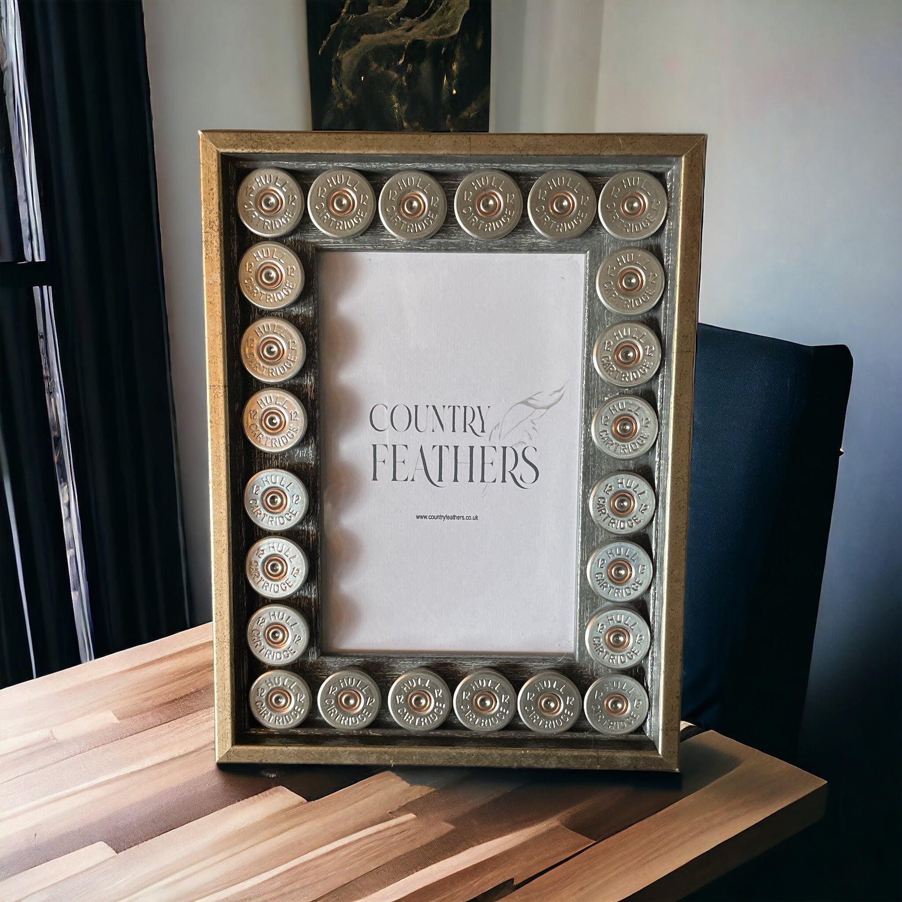A rustic grey wood effect frame with a subtle metallic gold edging decorated in recycled polished silver coloured cartridge heads. The country inspired frame fits a single 6x4 inch photo and can be wall hung or stood to suit your space.