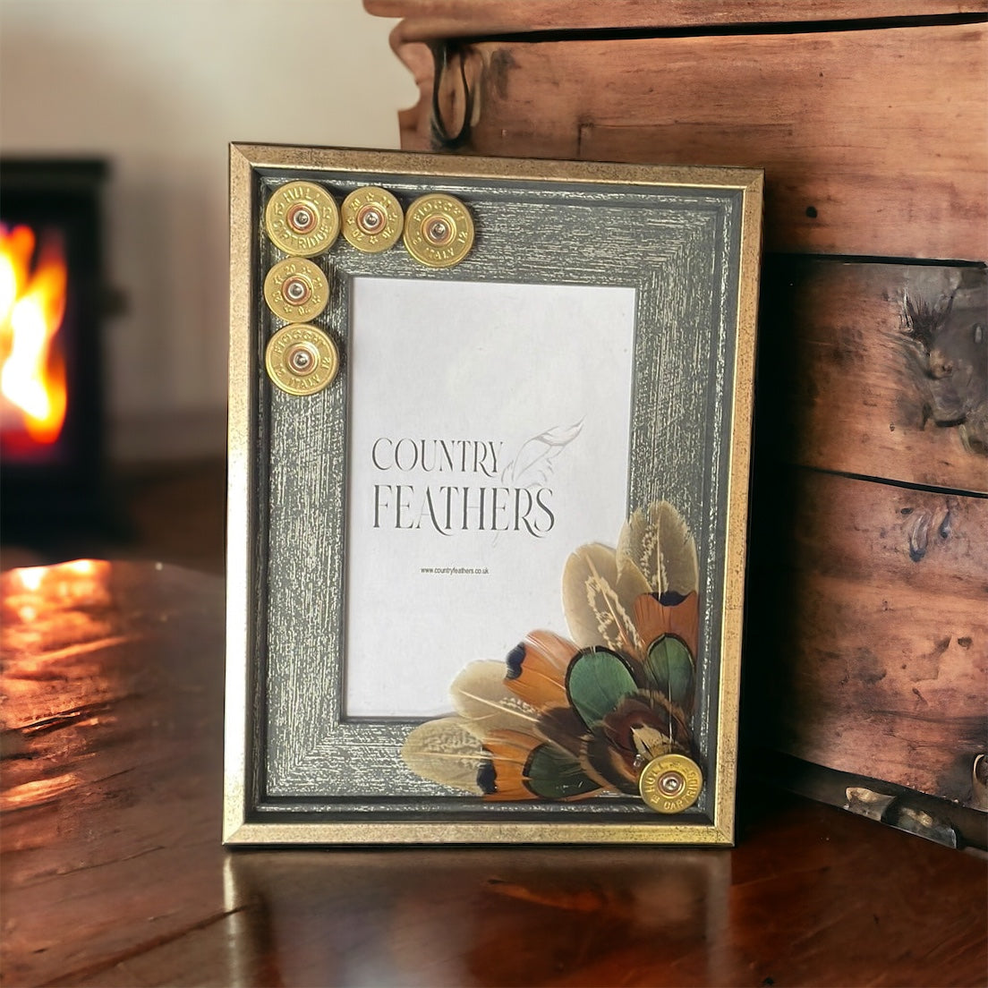 A rustic grey wood effect frame with a subtle metallic gold edging decorated in a recycled polished cartridge heads with pheasant and peacock feathers. The country inspired frame fits a single 6x4 inch photo and can be wall hung or stood to suit your space.