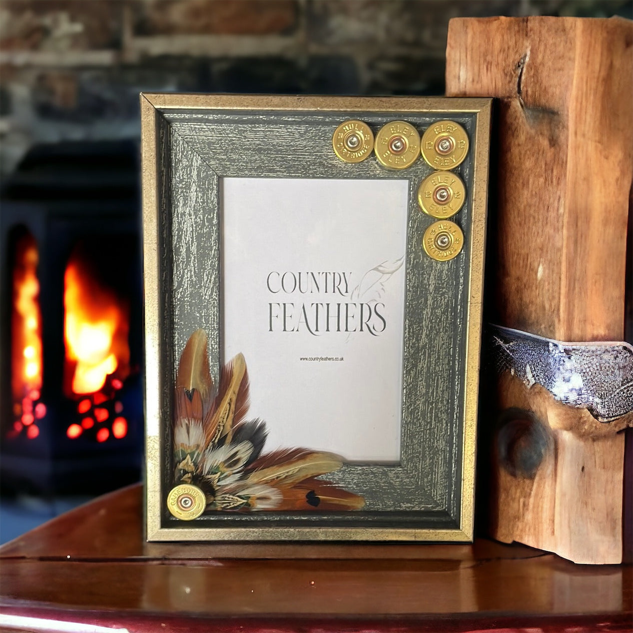 A rustic grey wood effect frame with a subtle metallic gold edging decorated in a recycled polished cartridge heads with pheasant and duck feathers.