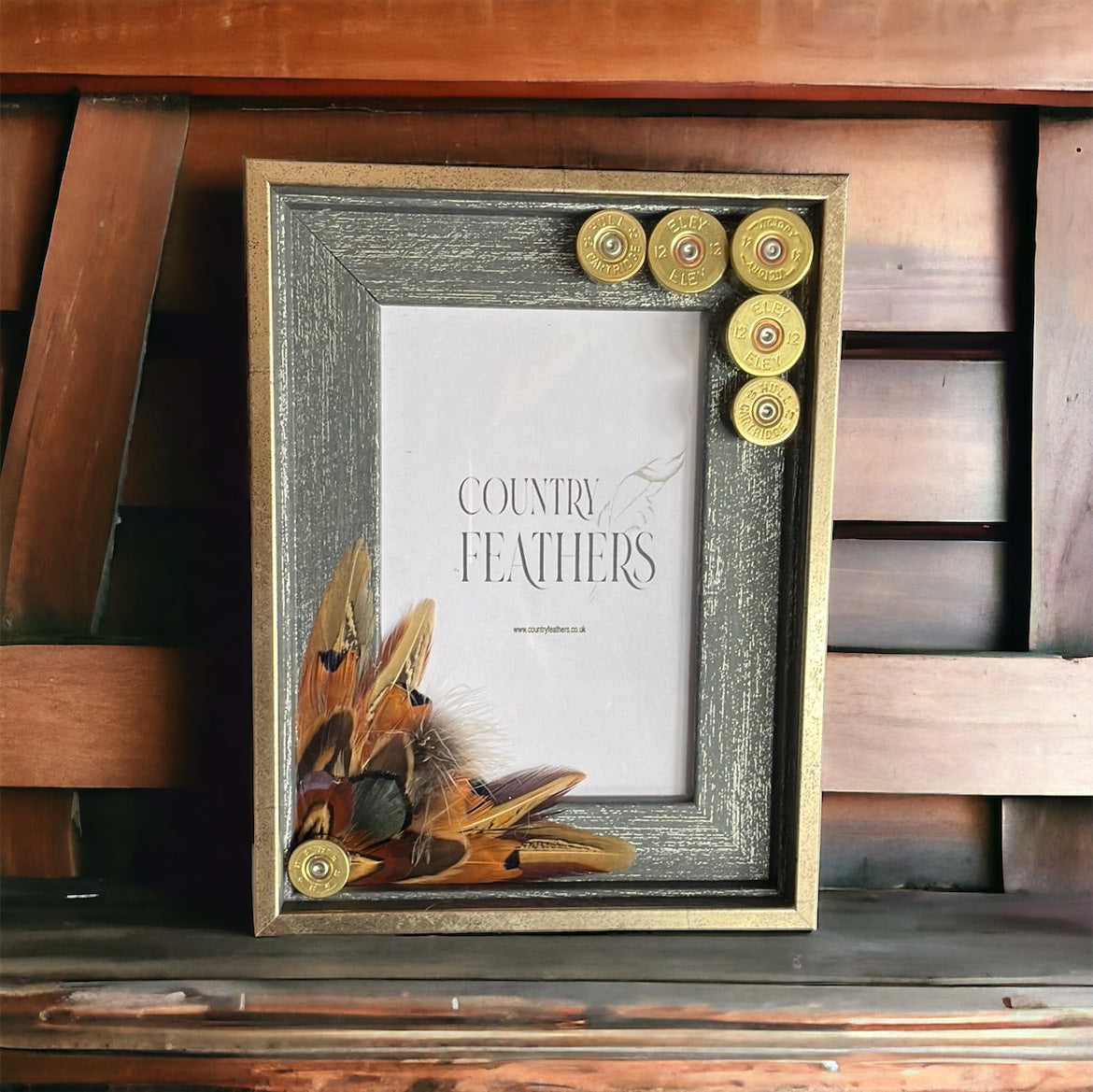 A rustic grey wood effect frame with a subtle metallic gold edging decorated in a recycled polished cartridge heads with pheasant and peacock feathers. The country inspired frame fits a single 6x4 inch photo and can be wall hung or stood to suit your space.