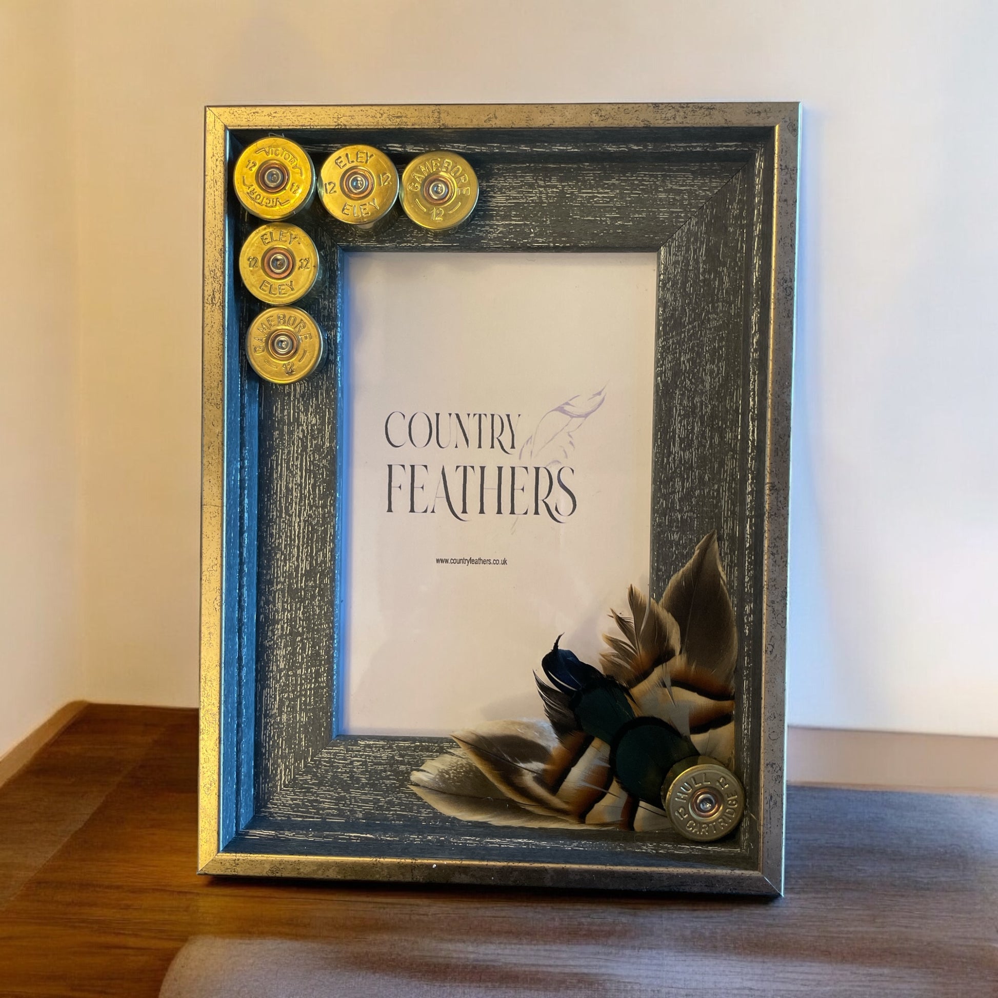 A rustic grey wood effect frame with a subtle metallic gold edging decorated in a recycled polished cartridge heads with peacock, partridge and duck feathers.