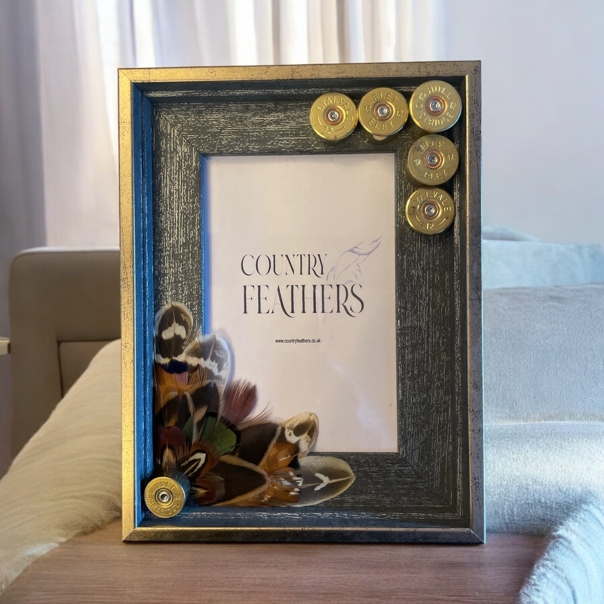 A rustic grey wood effect frame with a subtle metallic gold edging decorated in a recycled polished cartridge heads with pheasant, duck and peacock feathers.