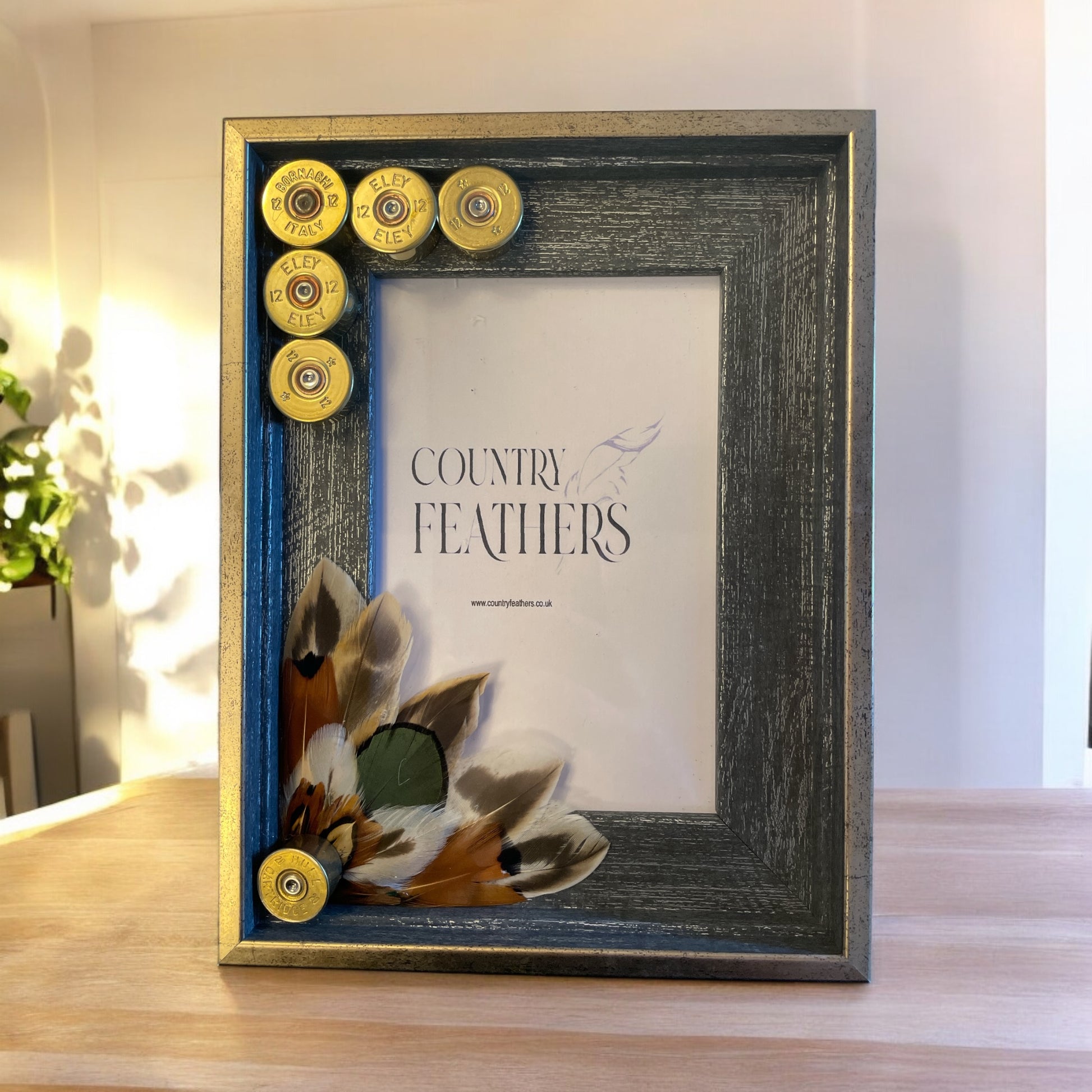 A rustic grey wood effect frame with a subtle metallic gold edging decorated in a recycled polished cartridge heads with pheasant, duck and peacock feathers.
