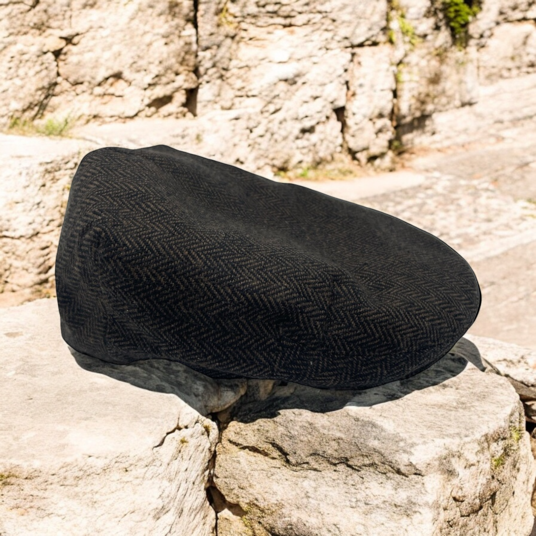 A brown wool mix herringbone children's flat cap with 100% polyester lining for children.
