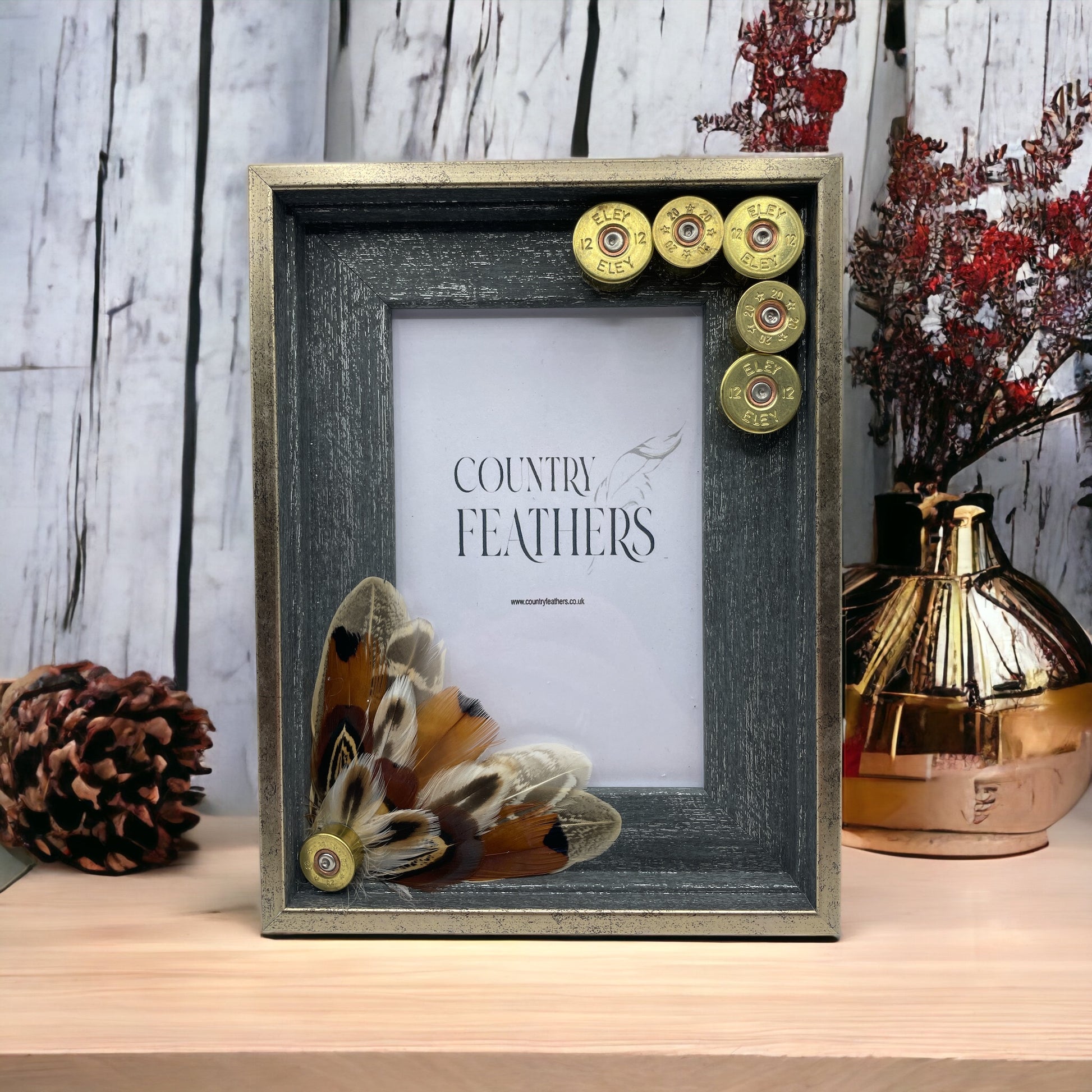 A rustic grey wood effect frame with a subtle metallic gold edging decorated in a recycled polished cartridge heads with pheasant and duck feathers.