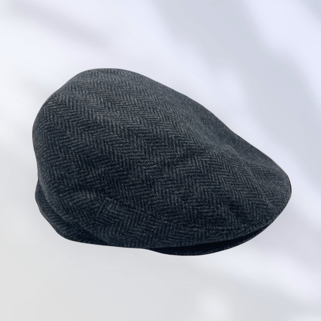 A dark grey 100% wool tweed flat cap with 100% polyester lining.