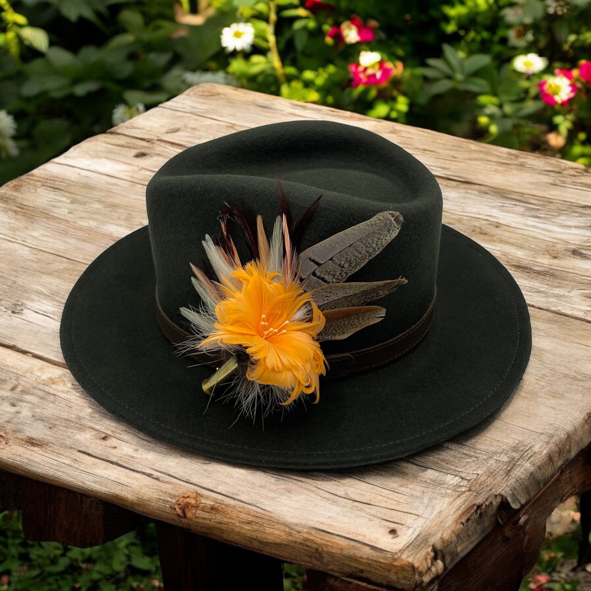 Feathers are in a recycled polished bullet case with a clasp attached for pinning through the ribbon band or over the leather band on the hat. We add a magnet to the feathers for extra security and to minimise the movement of the feathers on the hat.