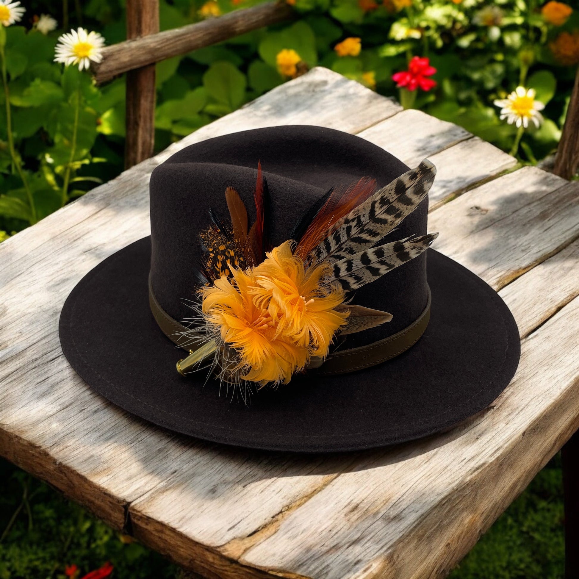 Feathers are in a recycled polished bullet case with a clasp attached for pinning through the ribbon band or over the leather band on the hat. We add a magnet to the feathers for extra security and to minimise the movement of the feathers on the hat.