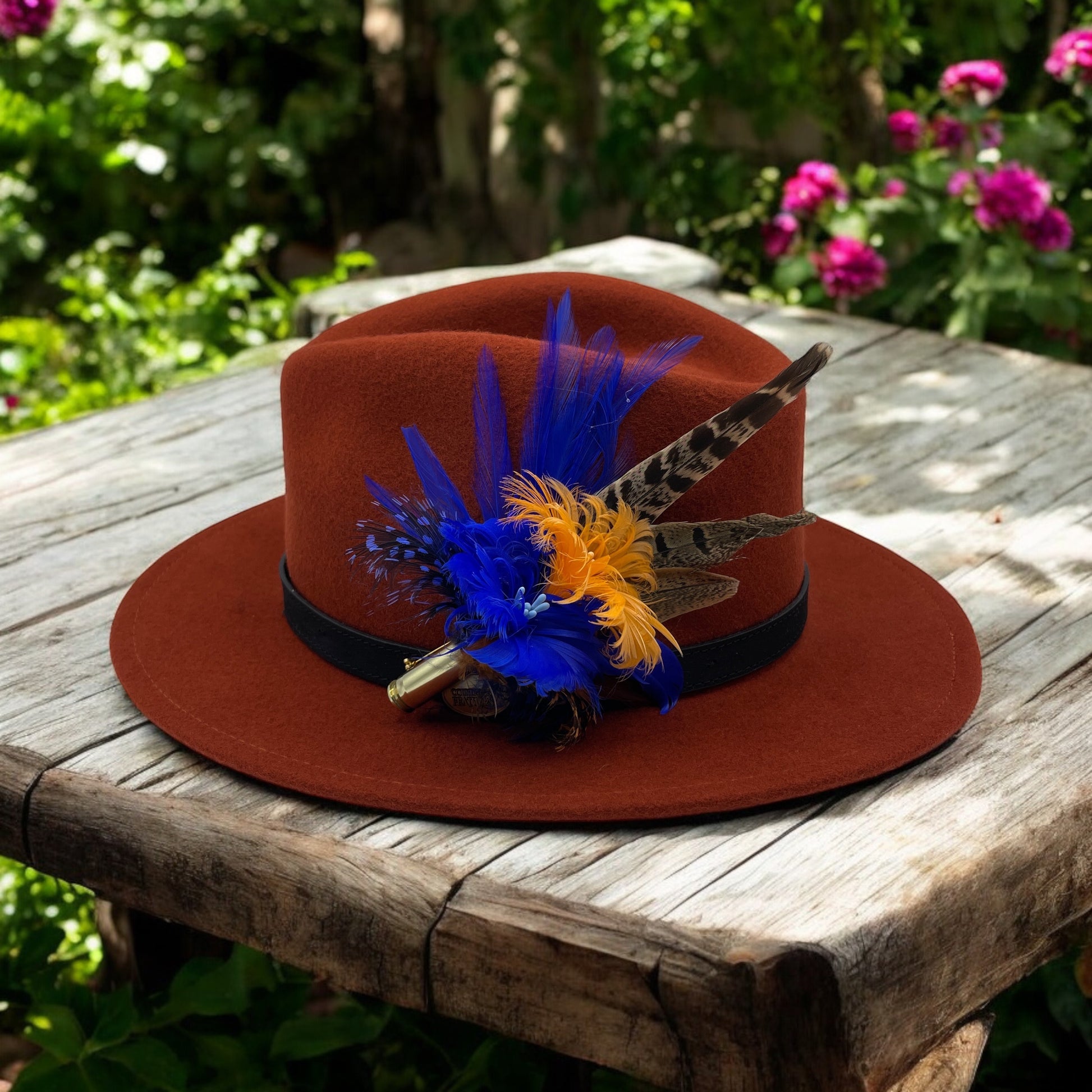 Feathers are in a recycled polished bullet case with a clasp attached for pinning through the ribbon band or over the leather band on the hat. We add a magnet to the feathers for extra security and to minimise the movement of the feathers on the hat.