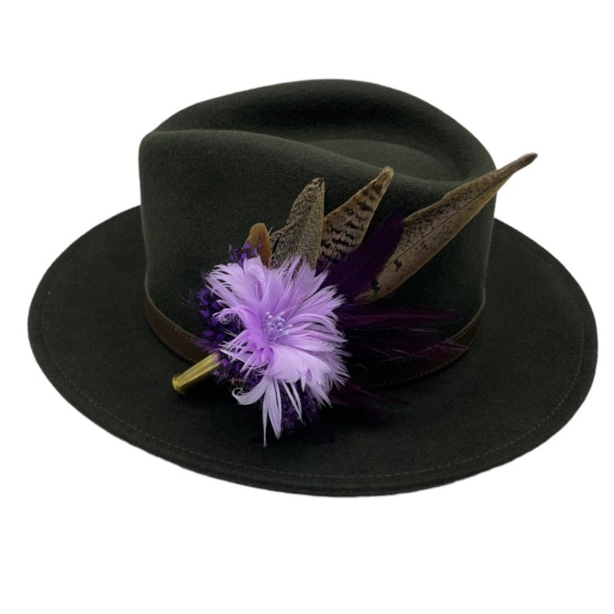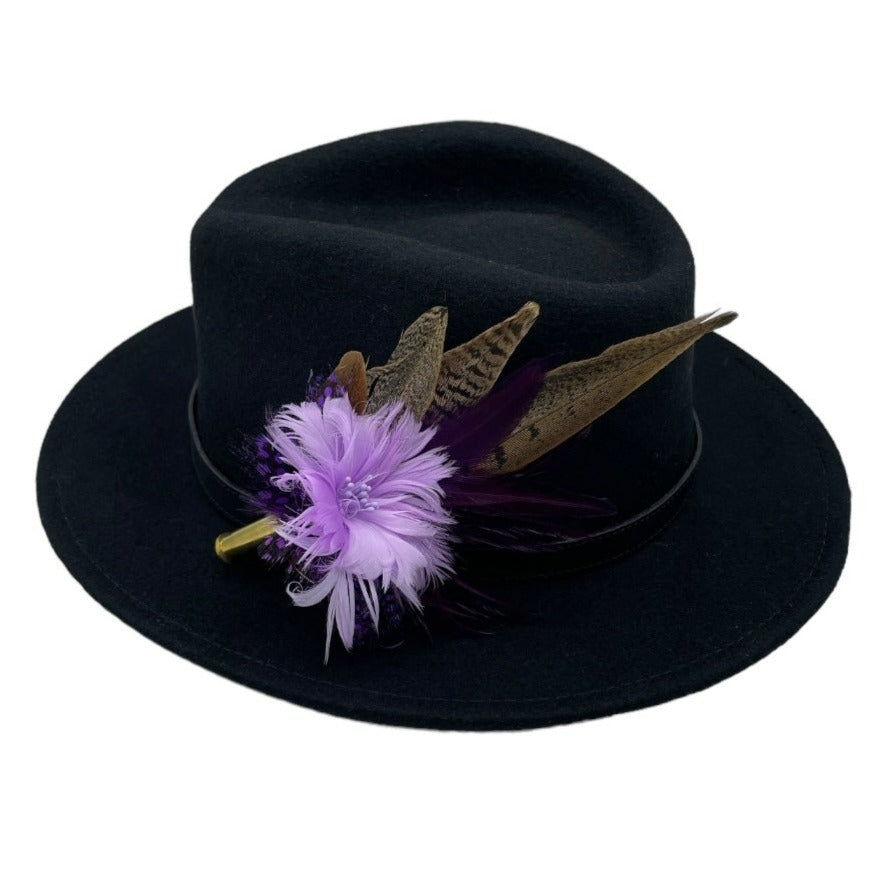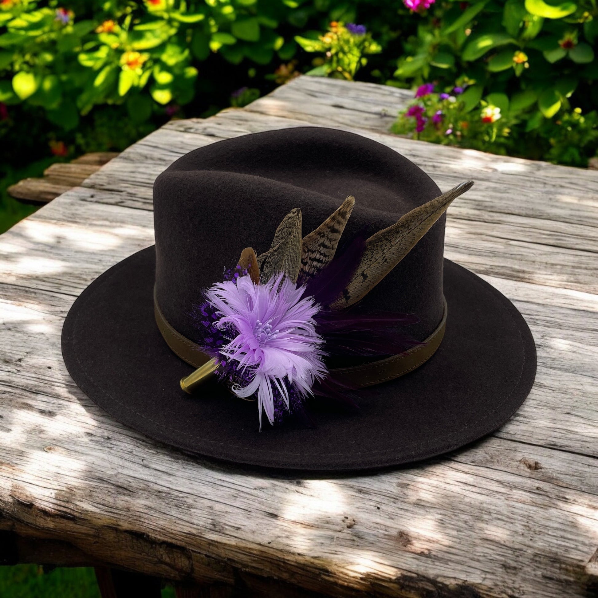 Feathers are in a recycled polished bullet case with a clasp attached for pinning through the ribbon band or over the leather band on the hat. We add a magnet to the feathers for extra security and to minimise the movement of the feathers on the hat.