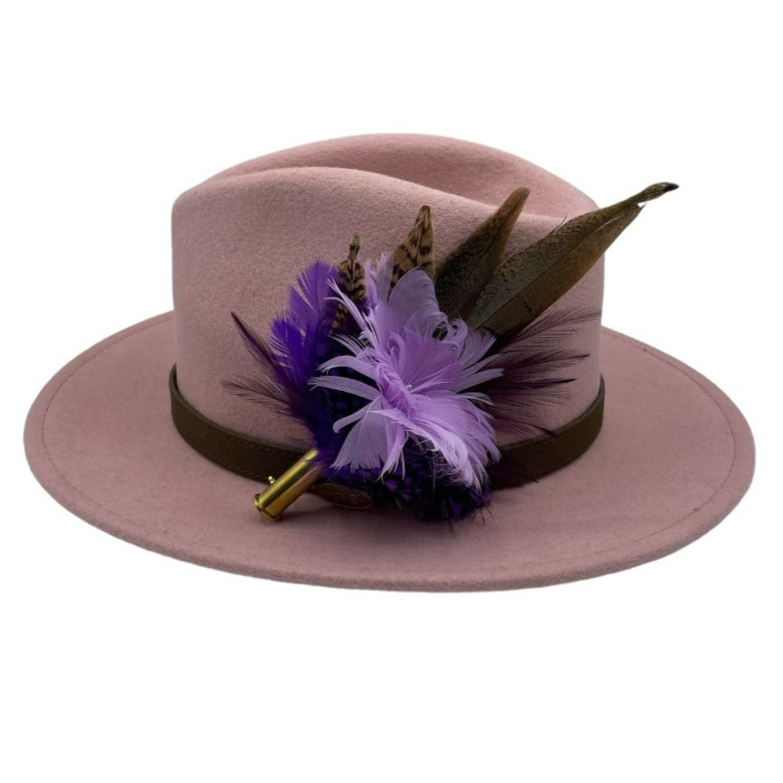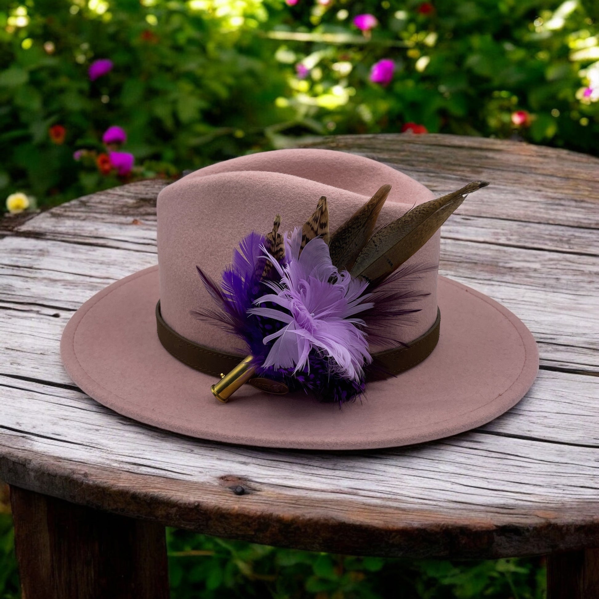 Feathers are in a recycled polished bullet case with a clasp attached for pinning through the ribbon band or over the leather band on the hat. We add a magnet to the feathers for extra security and to minimise the movement of the feathers on the hat.