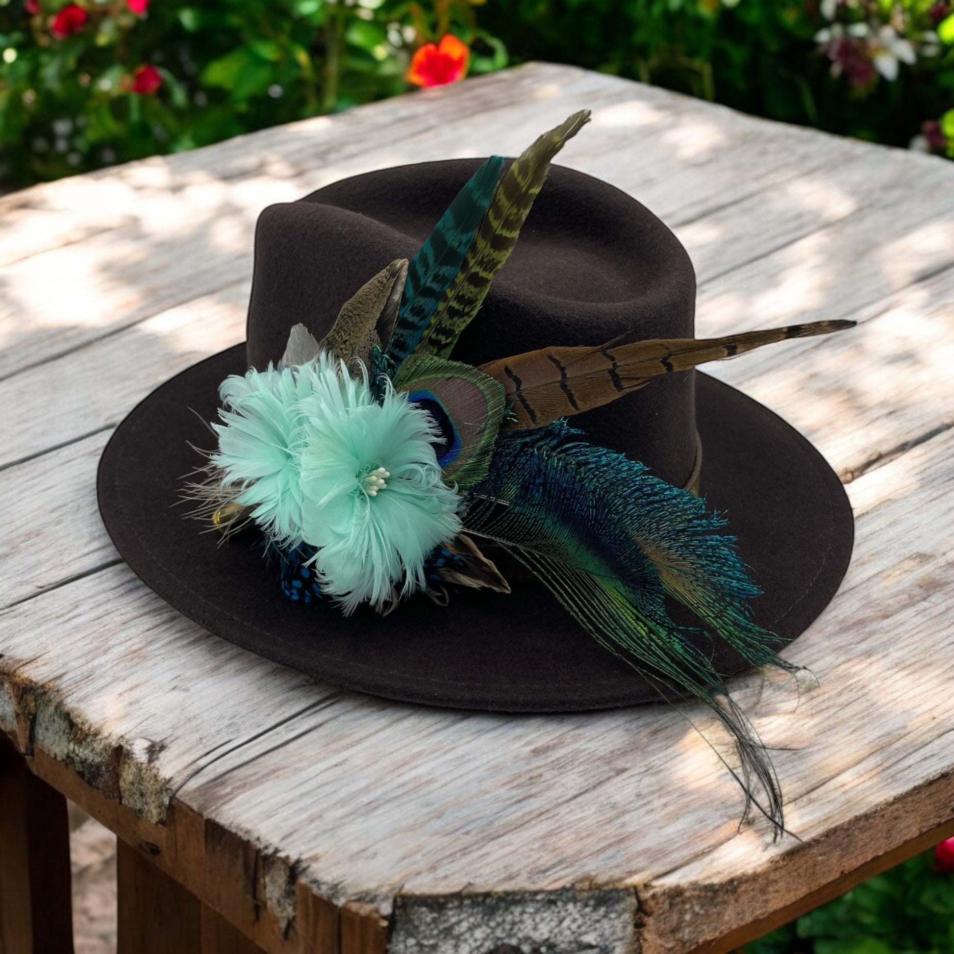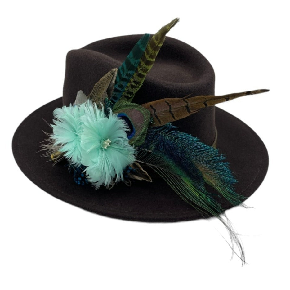 Feathers are in a recycled polished bullet case with a clasp attached for pinning through the ribbon band or over the leather band on the hat. We add a magnet to the feathers for extra security and to minimise the movement of the feathers on the hat.