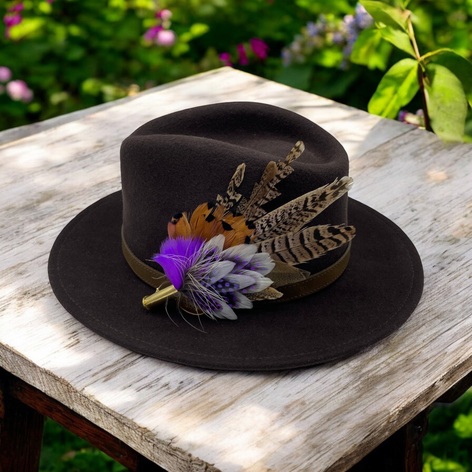 Feathers are in a recycled polished bullet case with a clasp attached for pinning through the ribbon band or over the leather band on the hat. We add a magnet to the feathers for extra security and to minimise the movement of the feathers on the hat.
