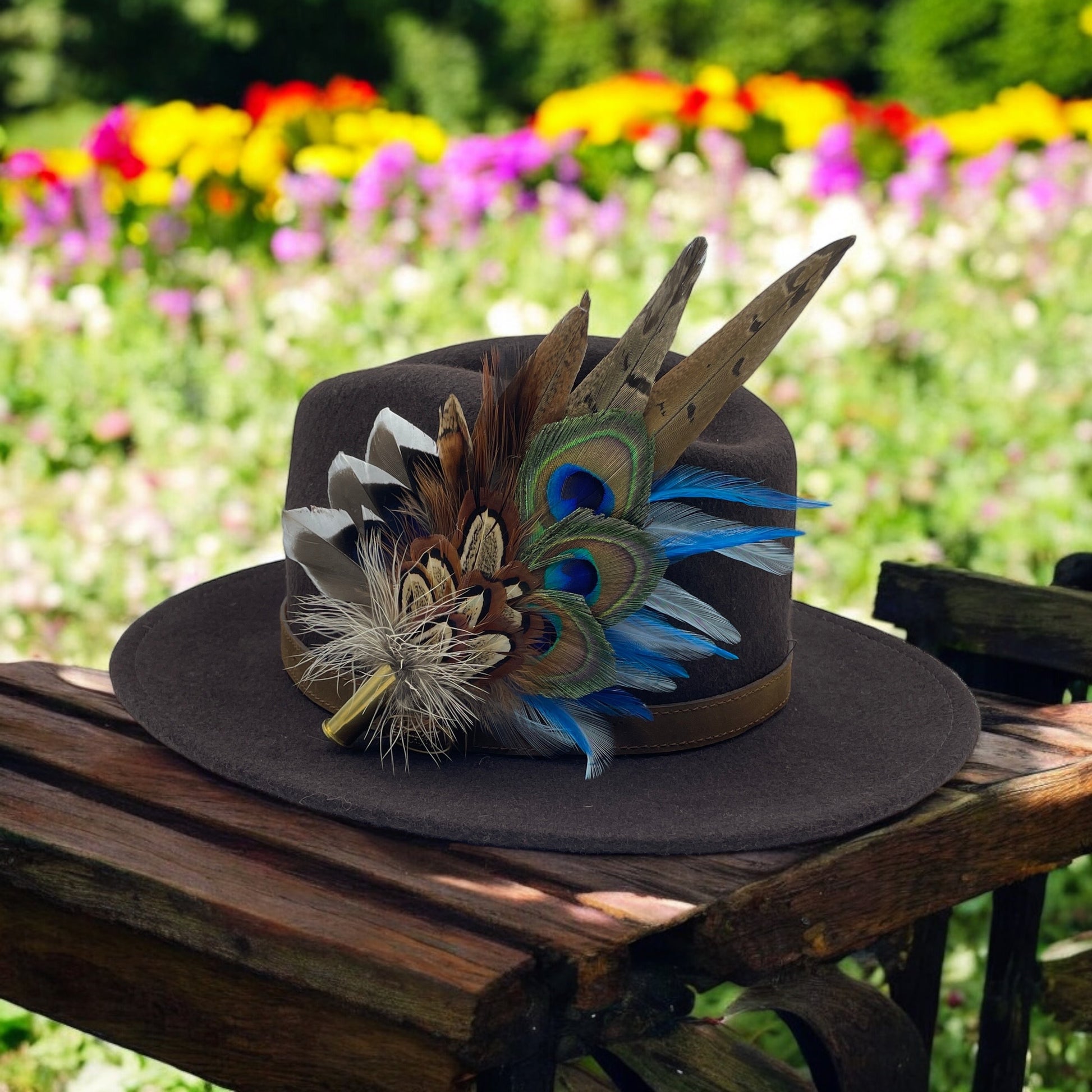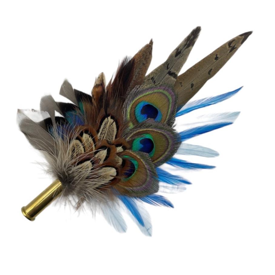 Feathers are in a recycled polished bullet case with a clasp attached for pinning through the ribbon band or over the leather band on the hat. We add a magnet to the feathers for extra security and to minimize the movement of the feathers on the hat.