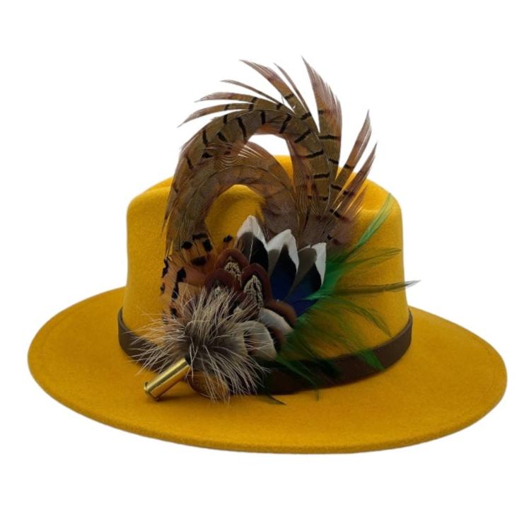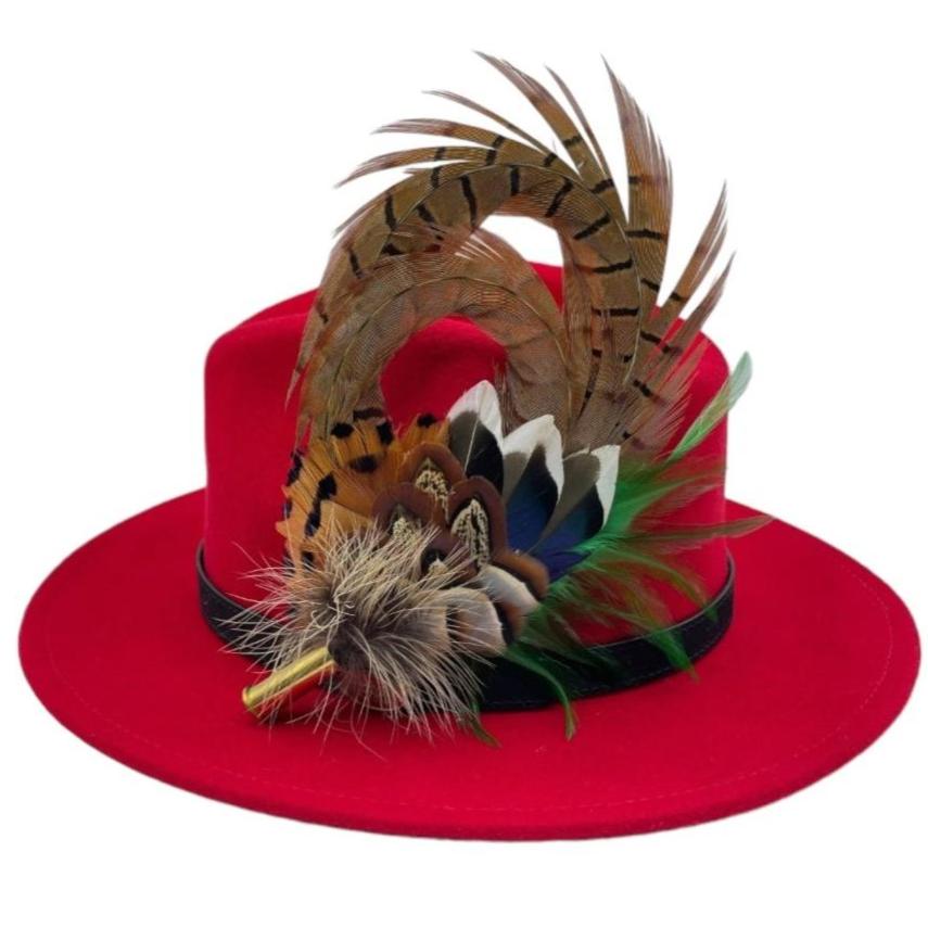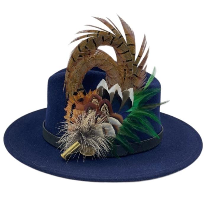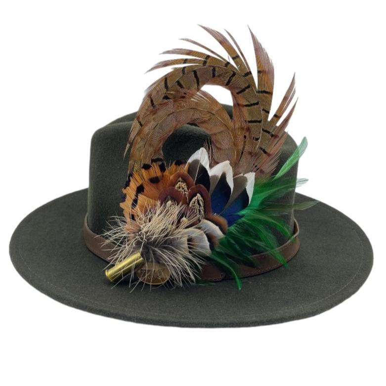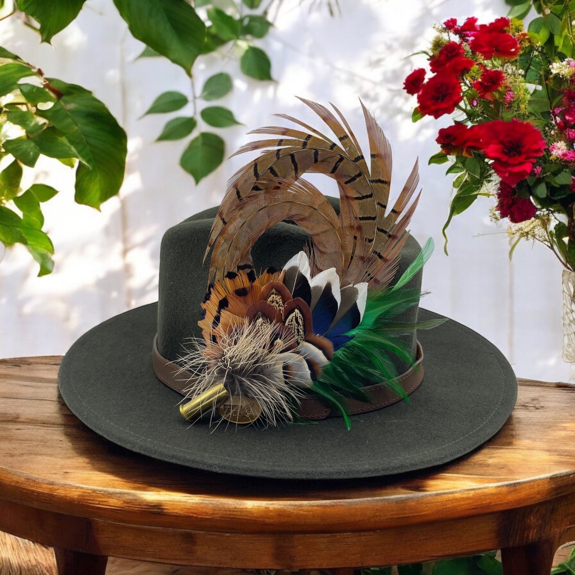 Feathers are in a recycled polished bullet case with a clasp attached for pinning through the ribbon band or over the leather band on the hat. We add a magnet to the feathers for extra security and to minimize the movement of the feathers on the hat.
