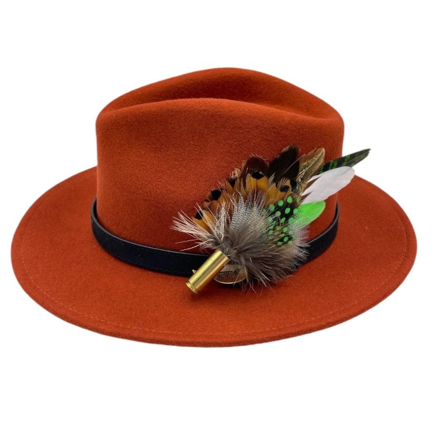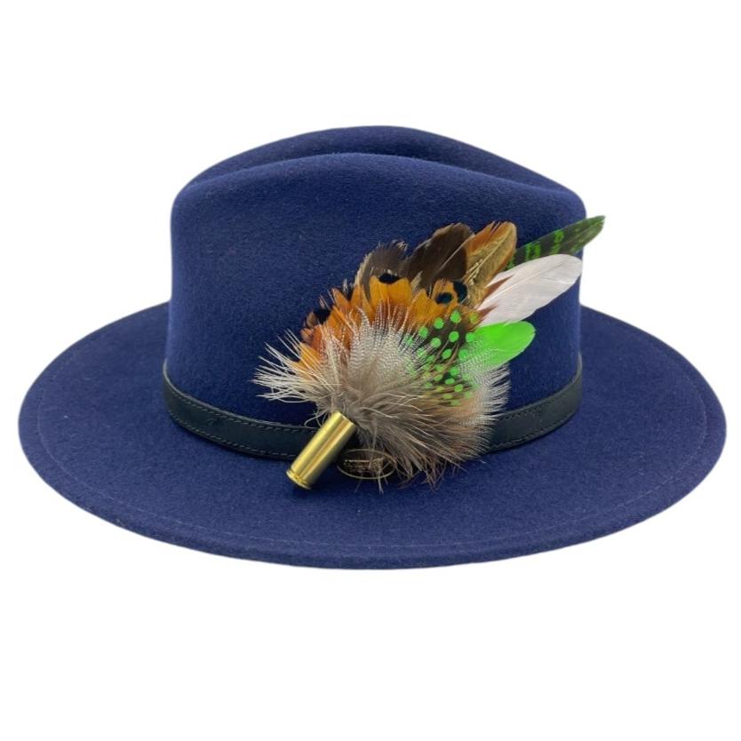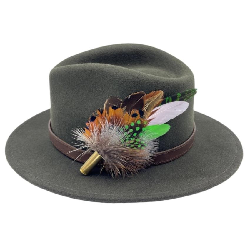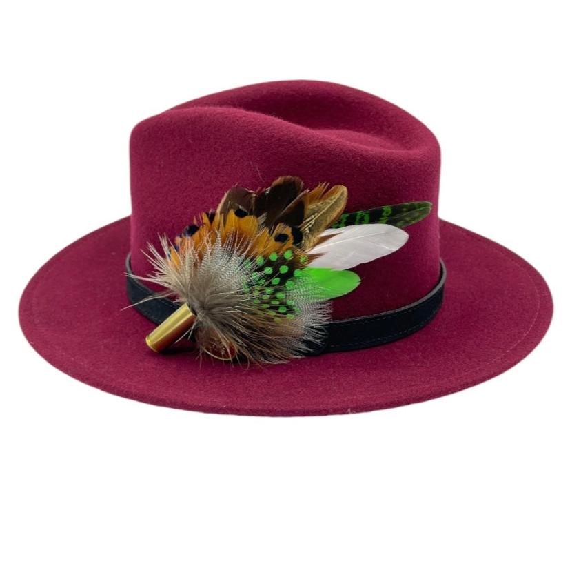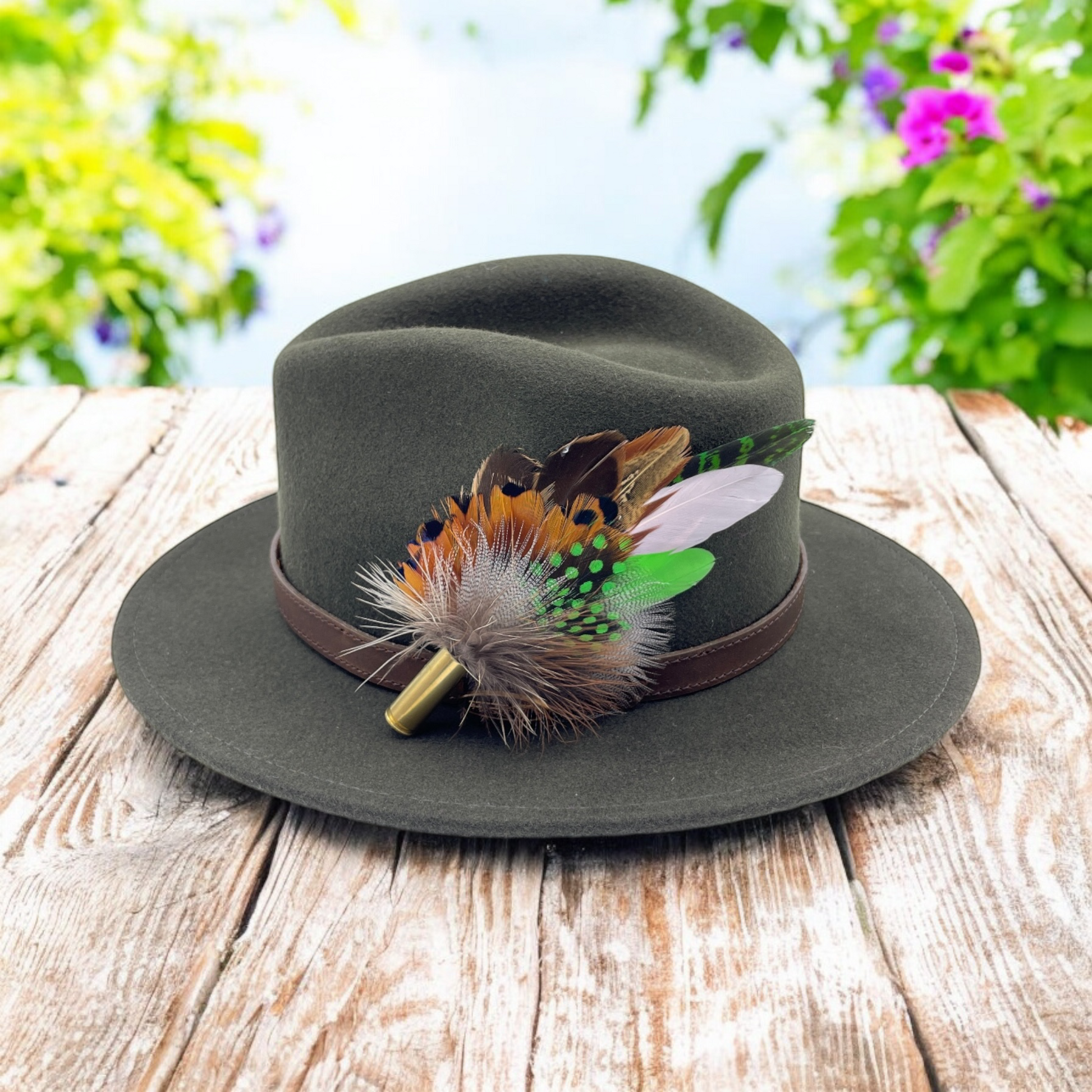Feathers are in a recycled polished bullet case with a clasp attached for pinning through the ribbon band or over the leather band on the hat. We add a magnet to the feathers for extra security and to minimize the movement of the feathers on the hat.