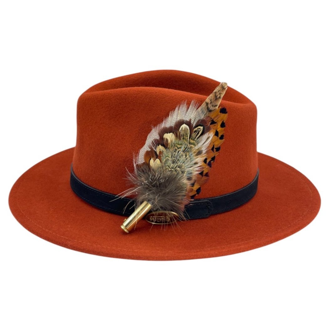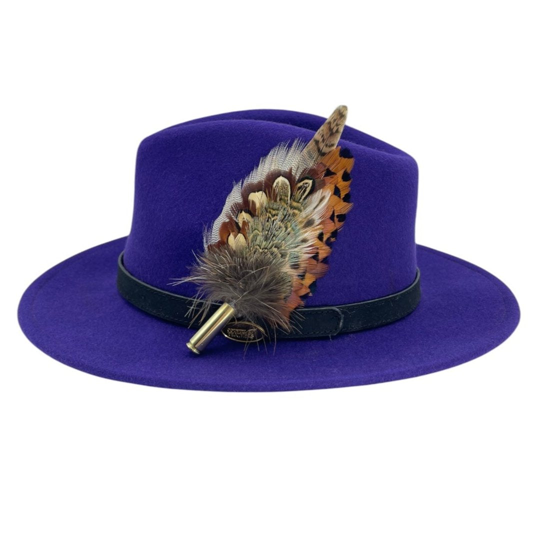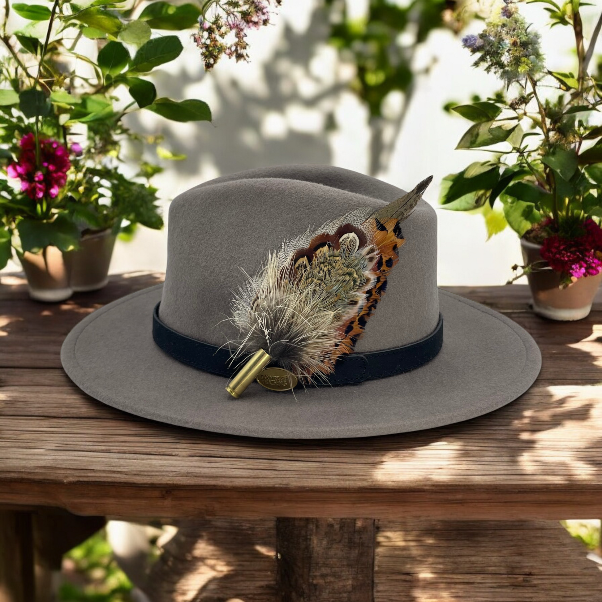 Feathers are in a recycled polished bullet case with a clasp attached for pinning through the ribbon band or over the leather band on the hat. We add a magnet to the feathers for extra security and to minimize the movement of the feathers on the hat.
