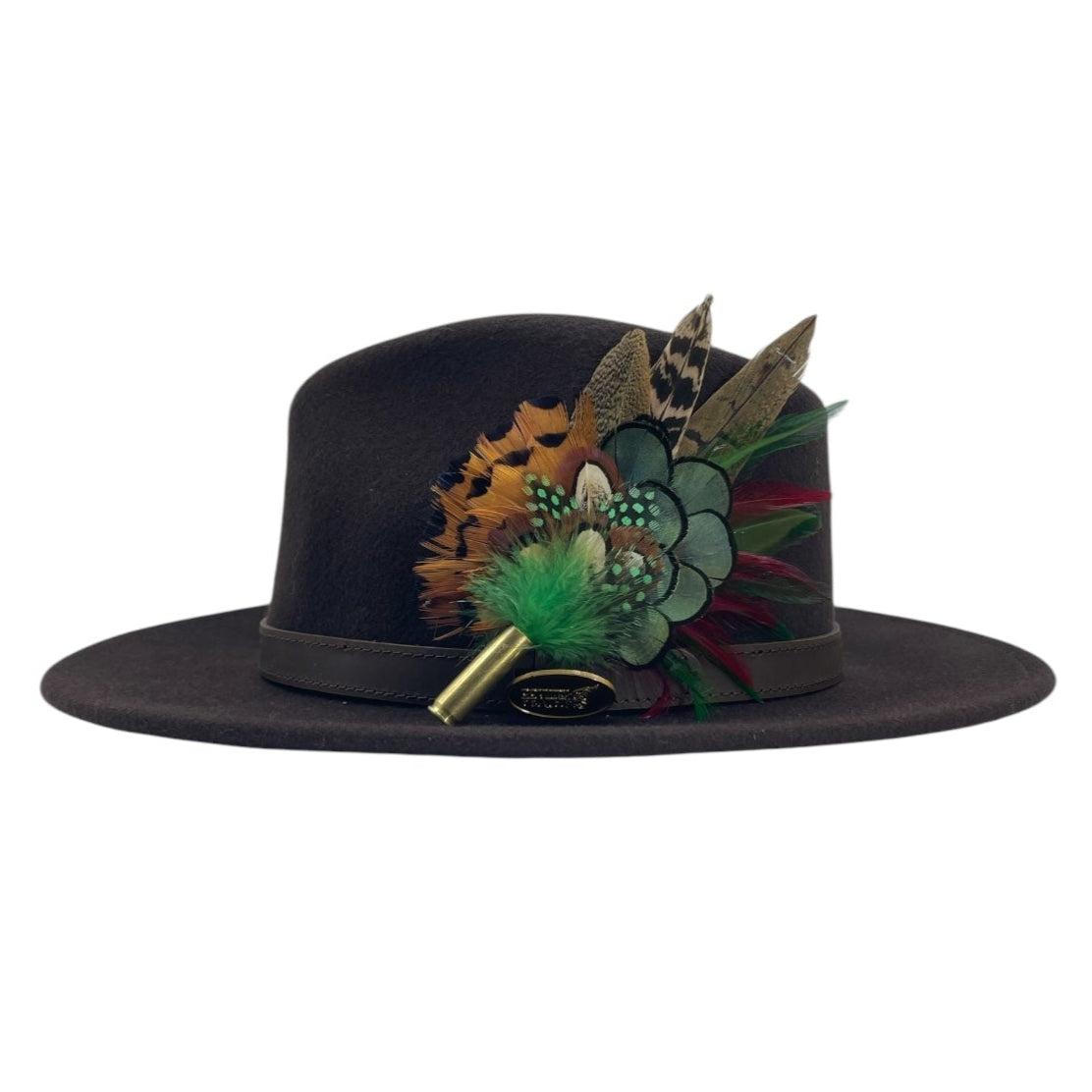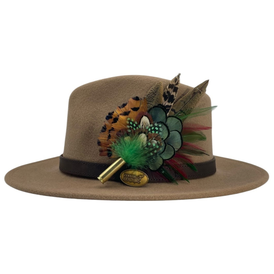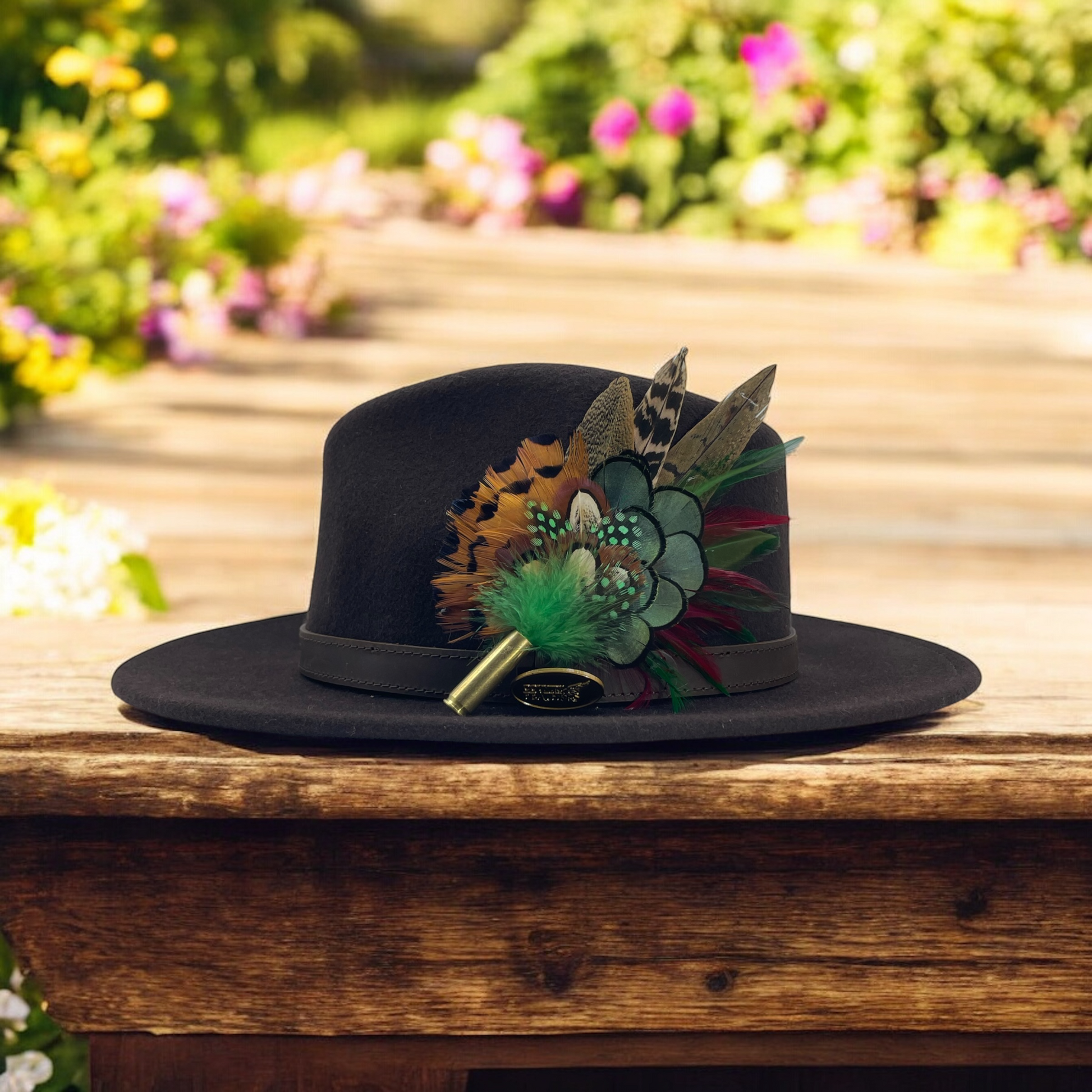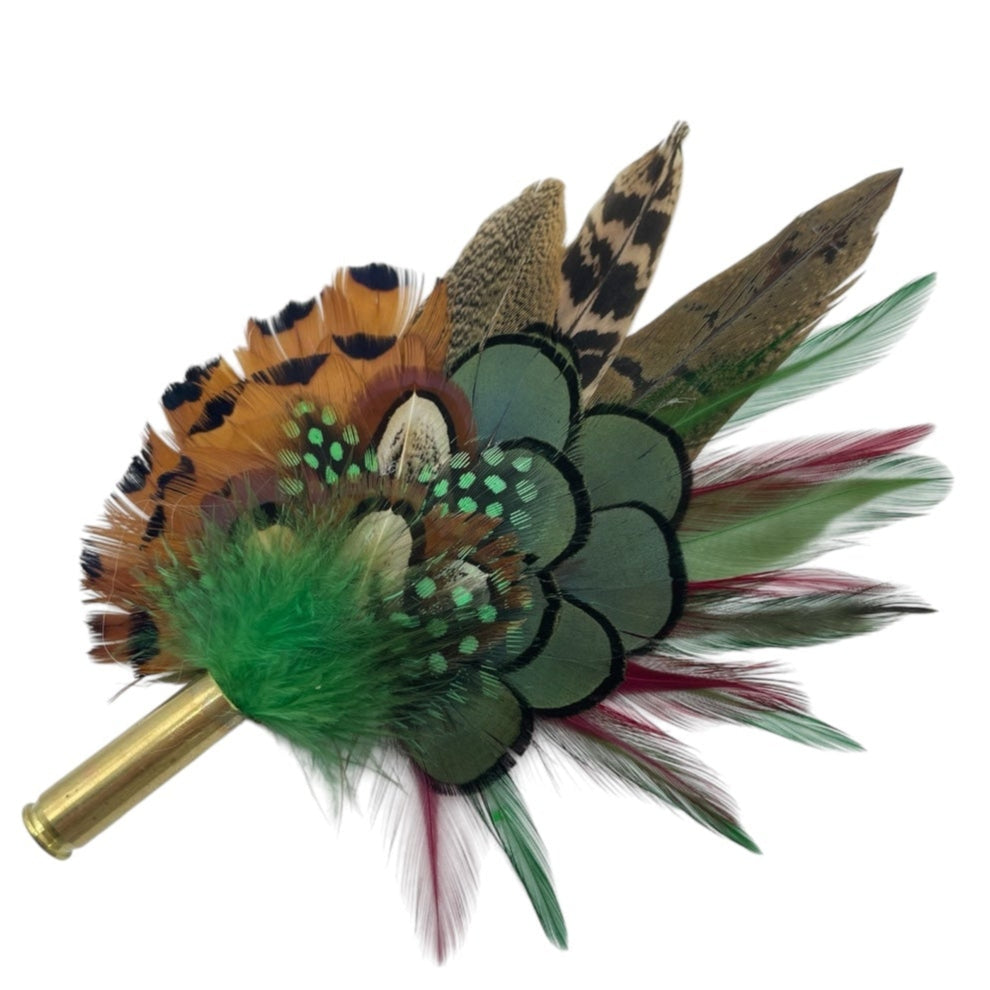 Feathers are in a recycled polished bullet case with a clasp attached for pinning through the ribbon band or over the leather band on the hat. We add a magnet to the feathers for extra security and to minimize the movement of the feathers on the hat.