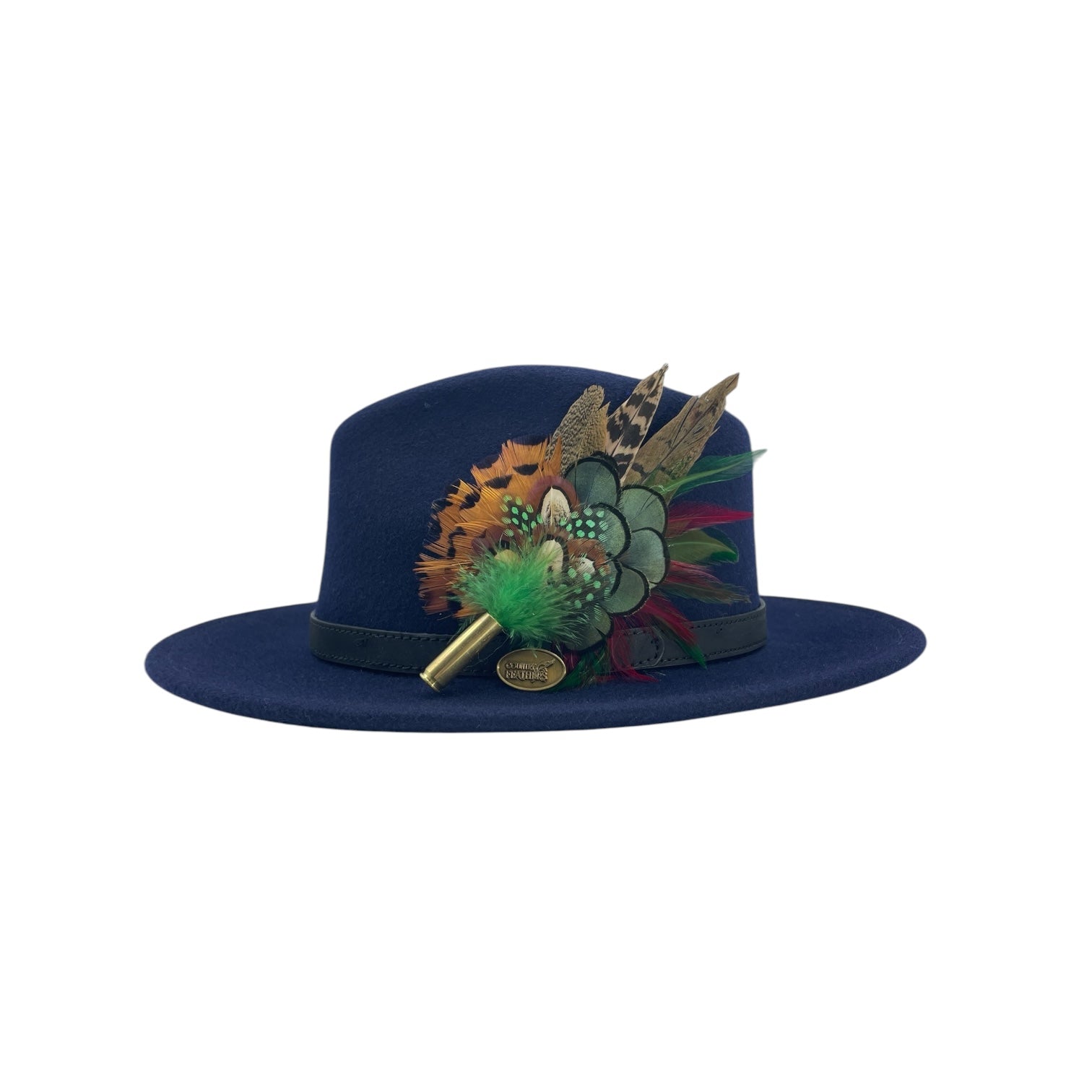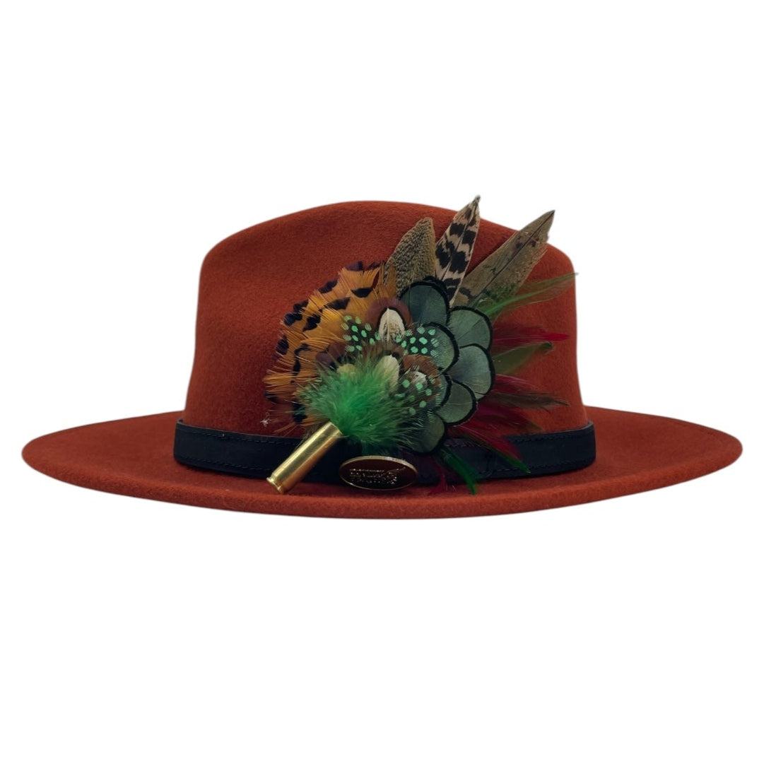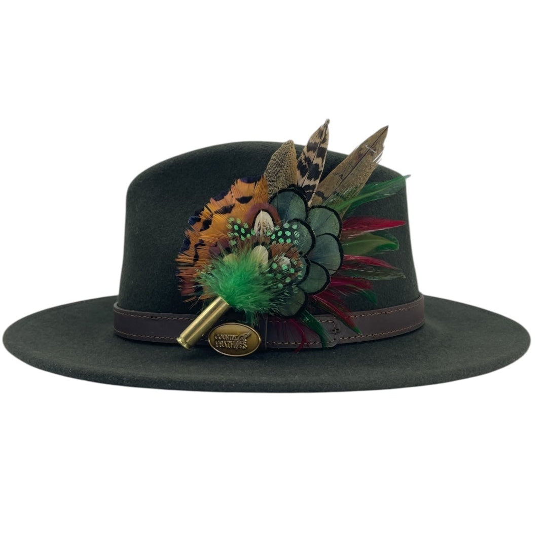 Feathers are in a recycled polished bullet case with a clasp attached for pinning through the ribbon band or over the leather band on the hat. We add a magnet to the feathers for extra security and to minimize the movement of the feathers on the hat.