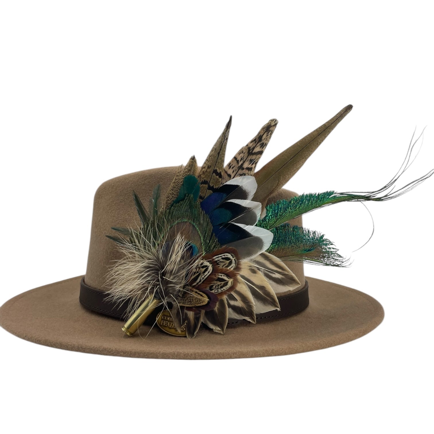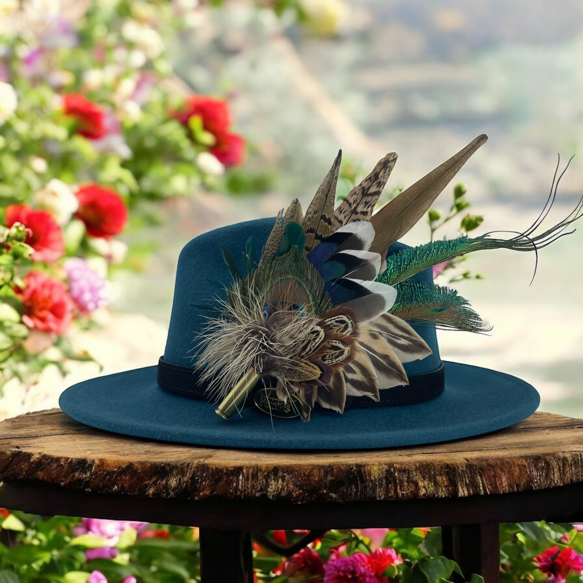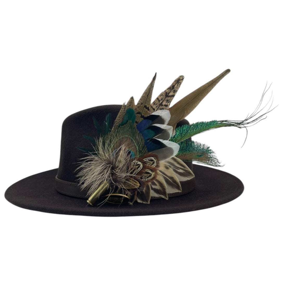 Feathers are in a recycled polished bullet case with a clasp attached for pinning through the ribbon band or over the leather band on the hat. We add a magnet to the feathers for extra security and to minimize the movement of the feathers on the hat.