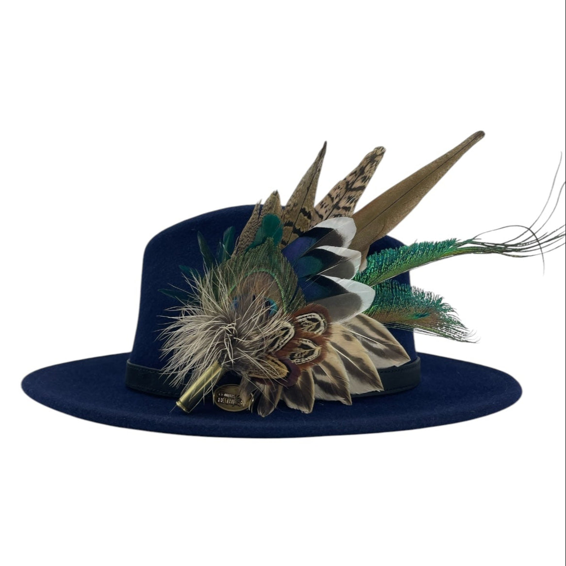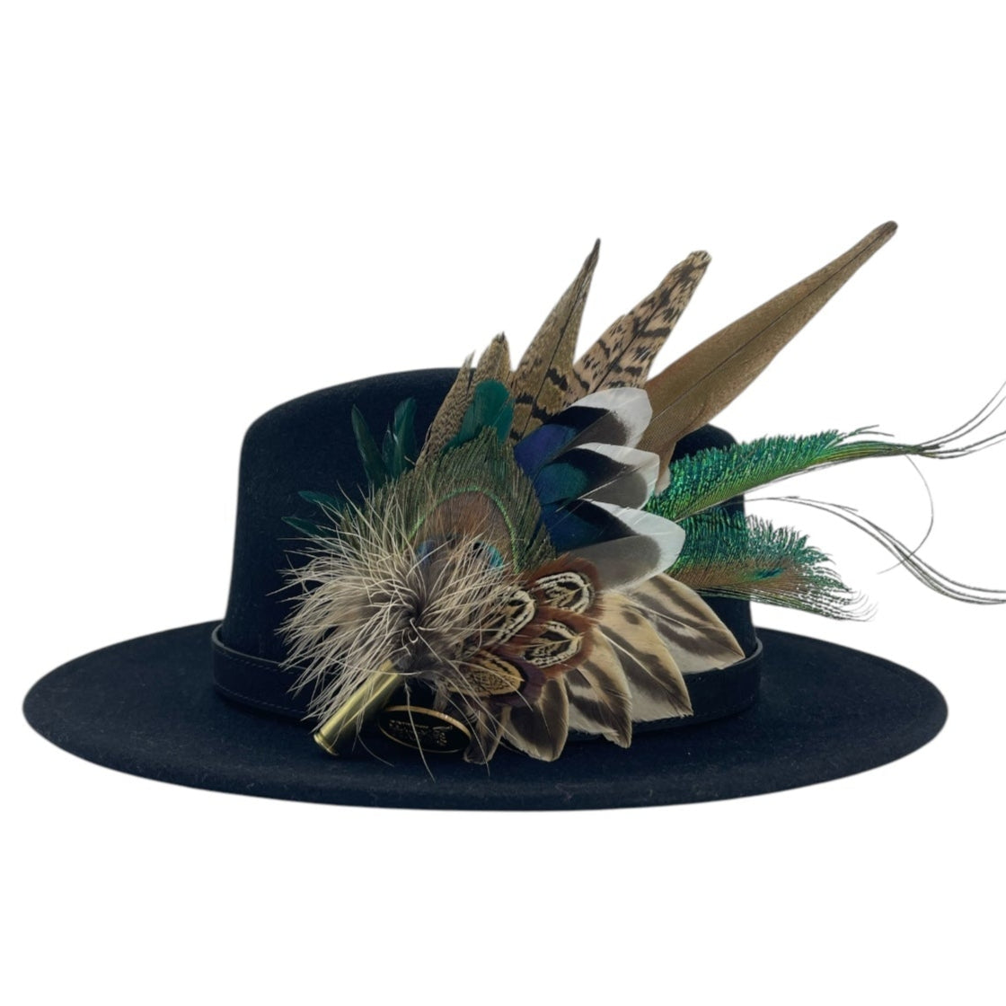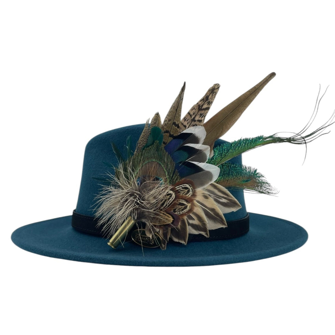 Feathers are in a recycled polished bullet case with a clasp attached for pinning through the ribbon band or over the leather band on the hat. We add a magnet to the feathers for extra security and to minimize the movement of the feathers on the hat.