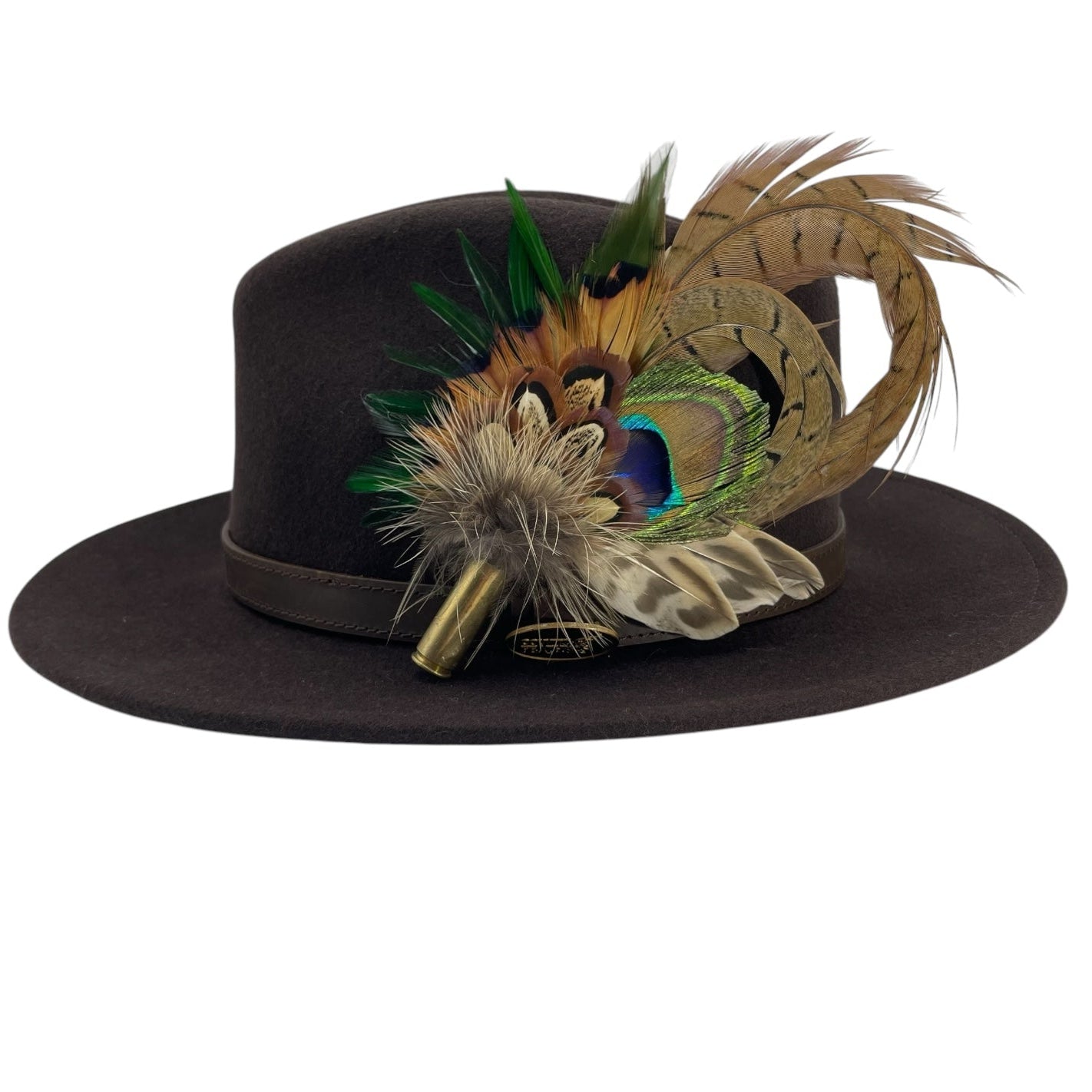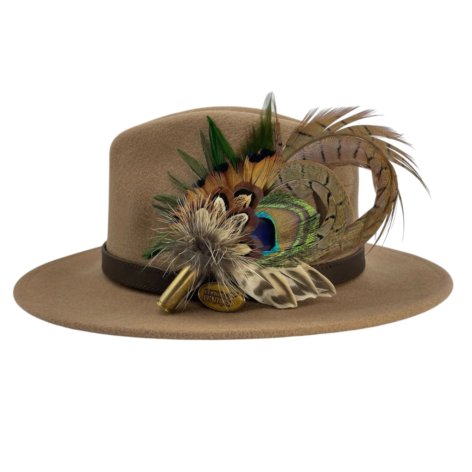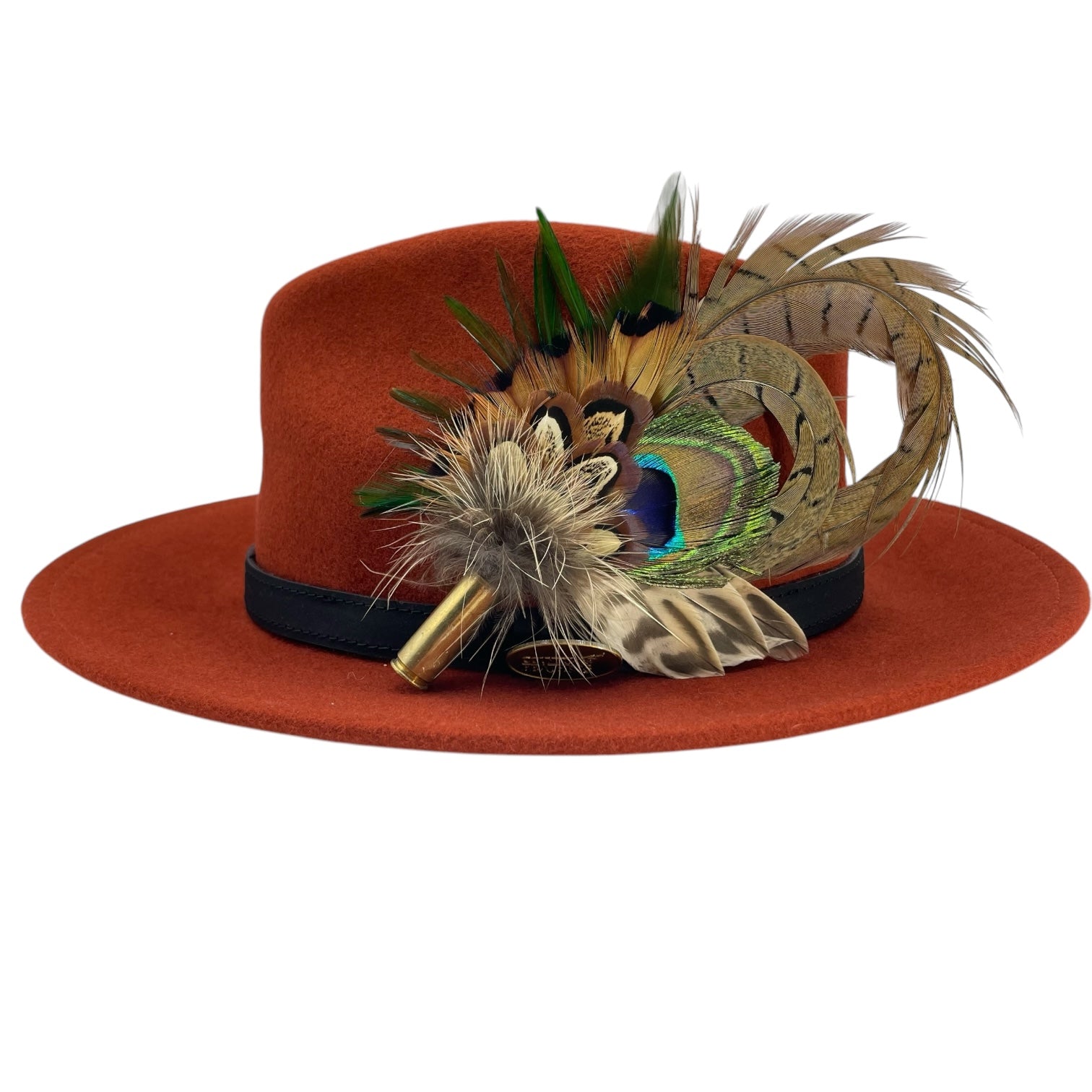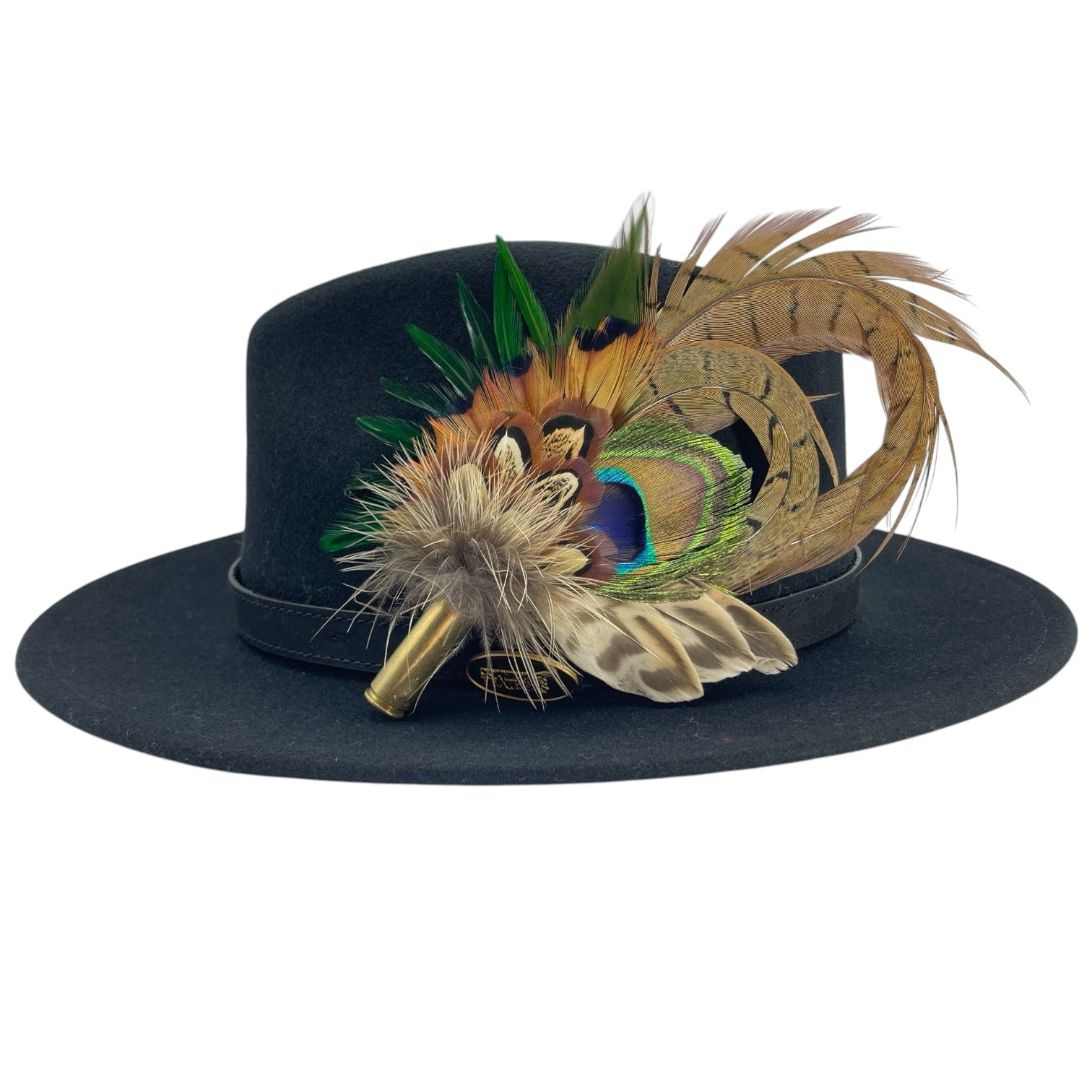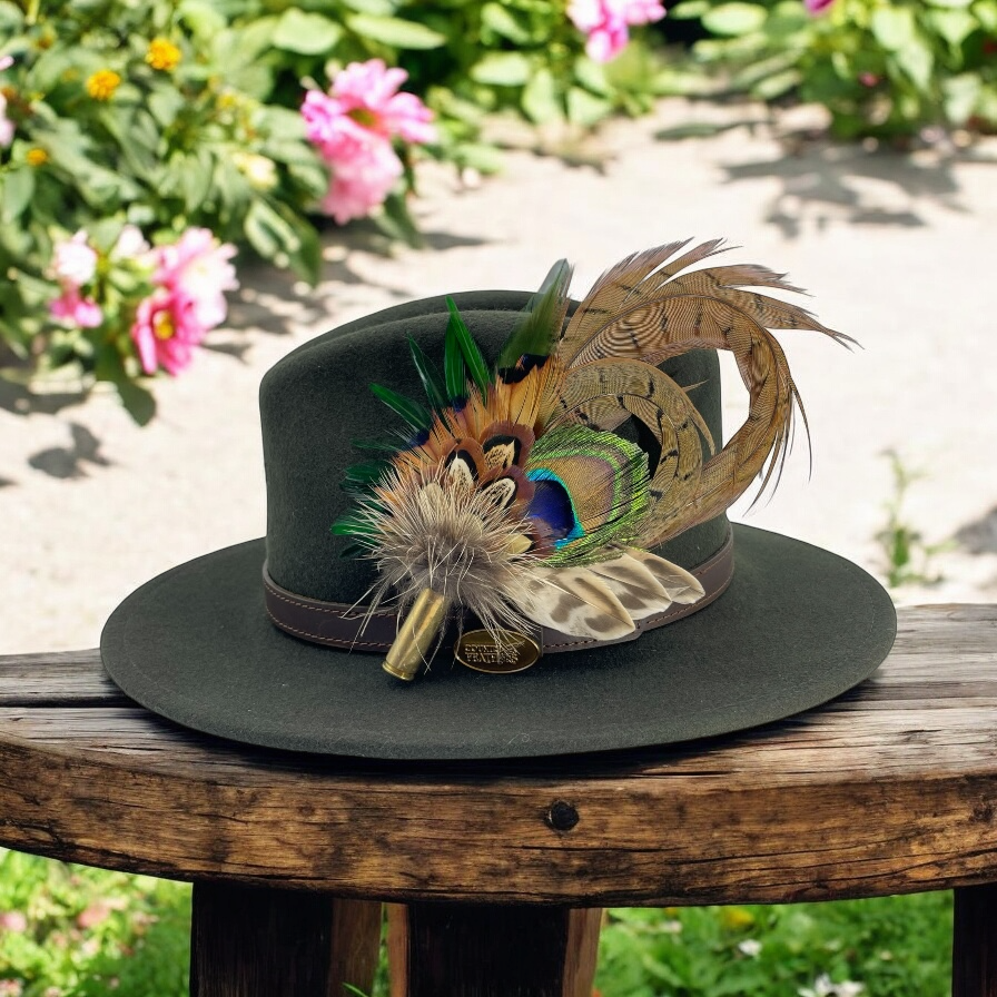 Feathers are in a recycled polished bullet case with a clasp attached for pinning through the ribbon band or over the leather band on the hat. We add a magnet to the feathers for extra security and to minimize the movement of the feathers on the hat.