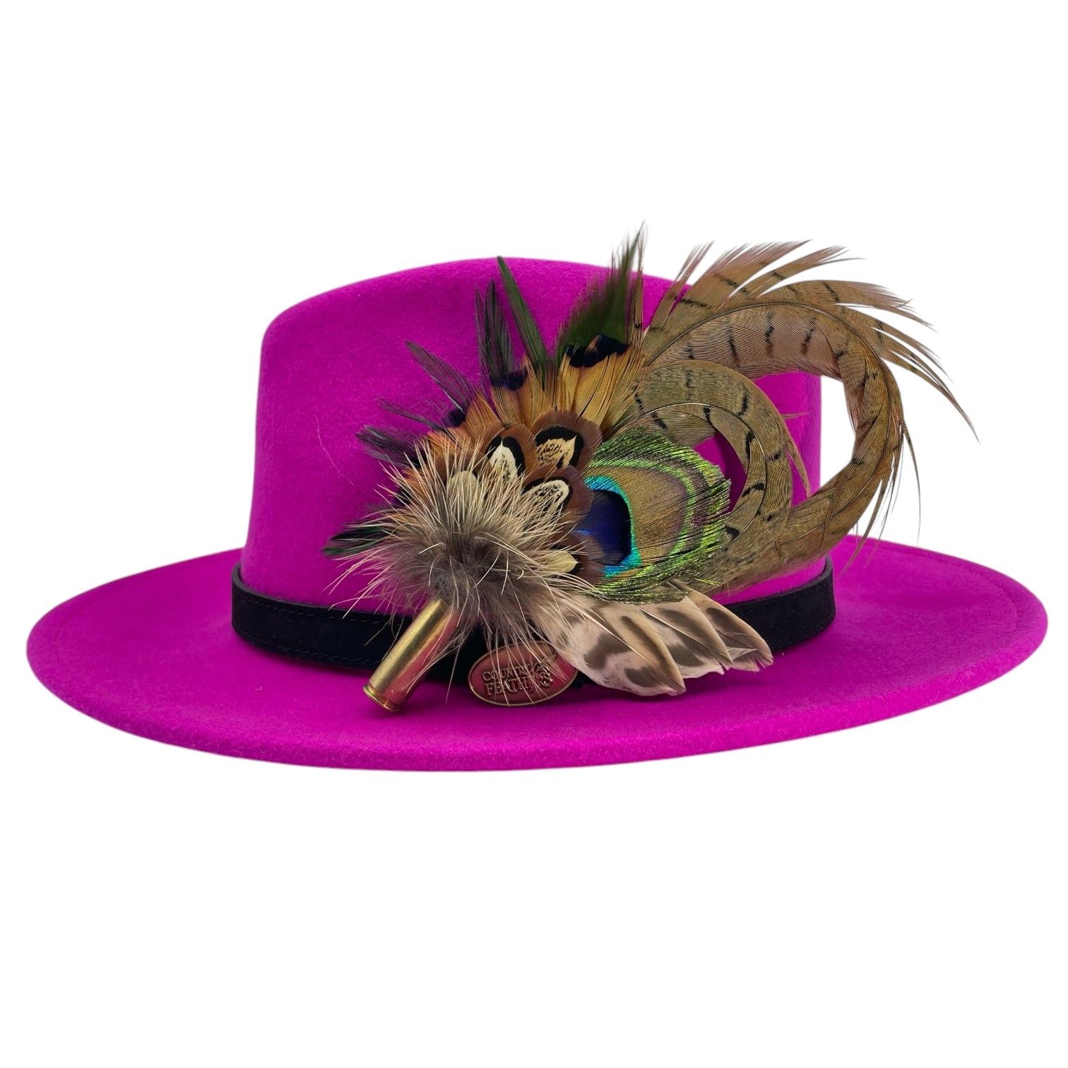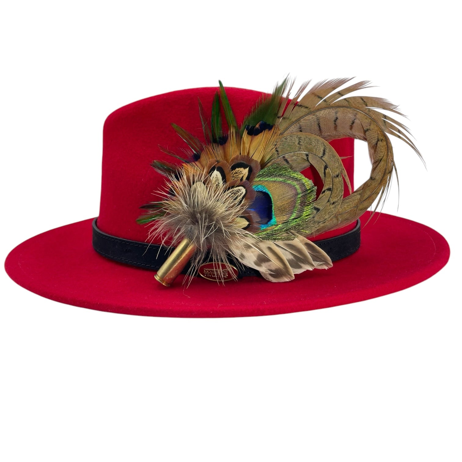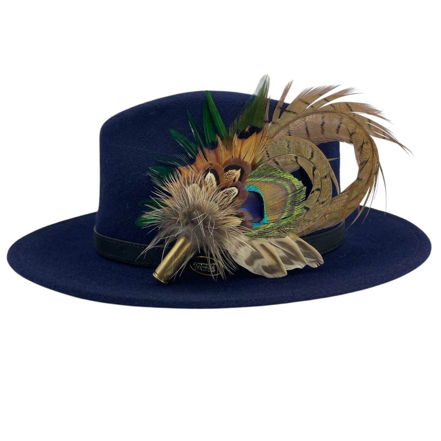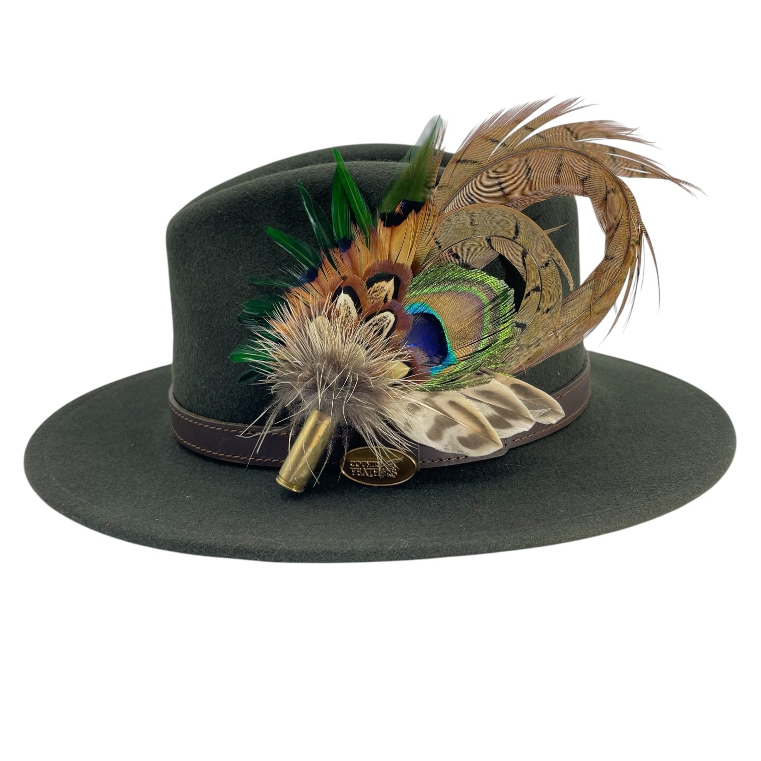 Feathers are in a recycled polished bullet case with a clasp attached for pinning through the ribbon band or over the leather band on the hat. We add a magnet to the feathers for extra security and to minimize the movement of the feathers on the hat.