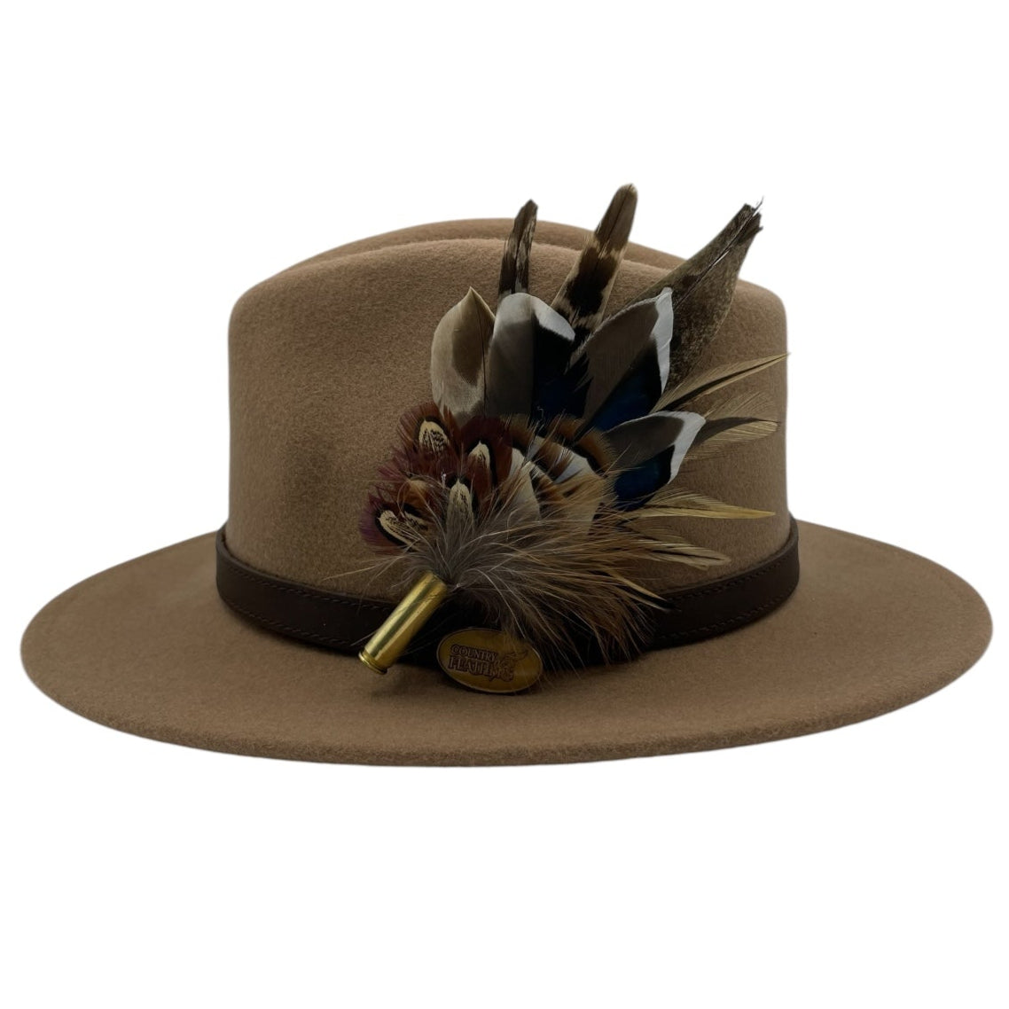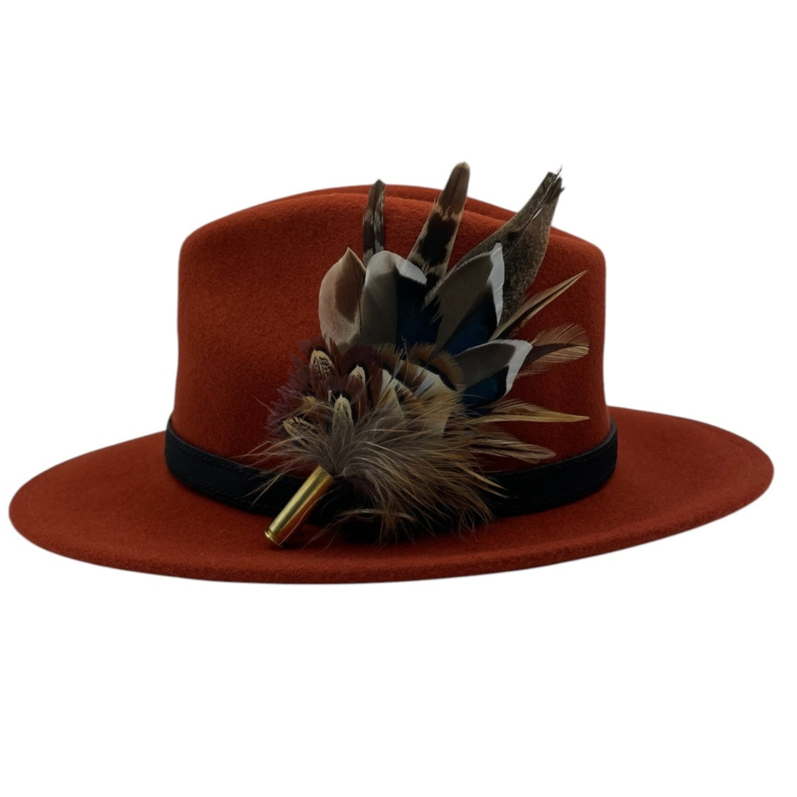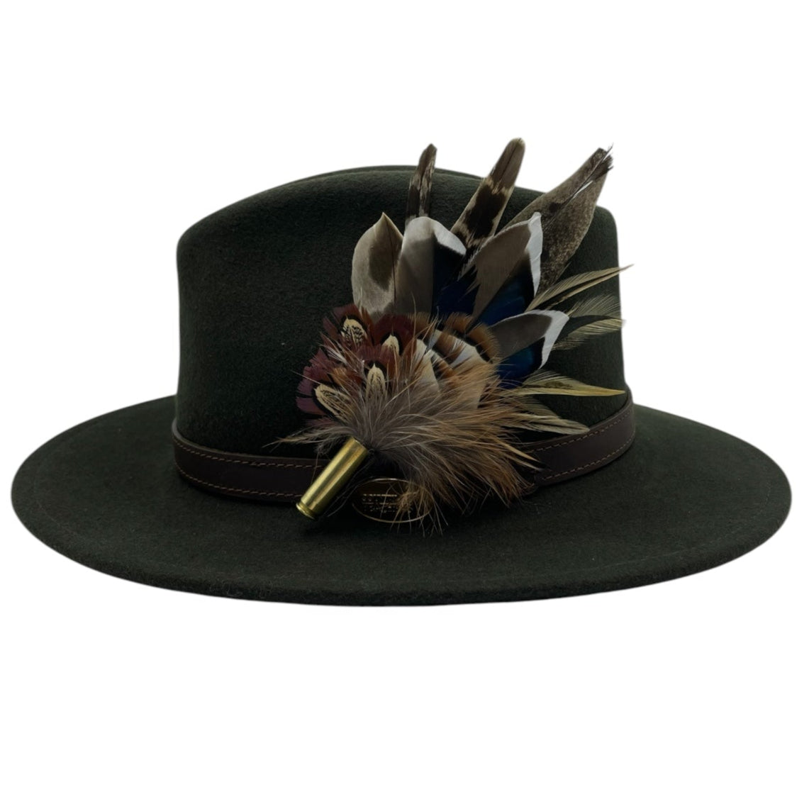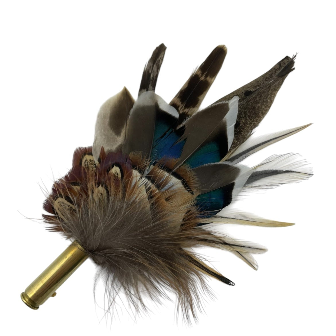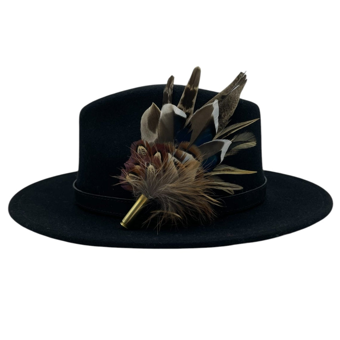 Feathers are in a recycled polished bullet case with a clasp attached for pinning through the ribbon band or over the leather band on the hat. We add a magnet to the feathers for extra security and to minimize the movement of the feathers on the hat.